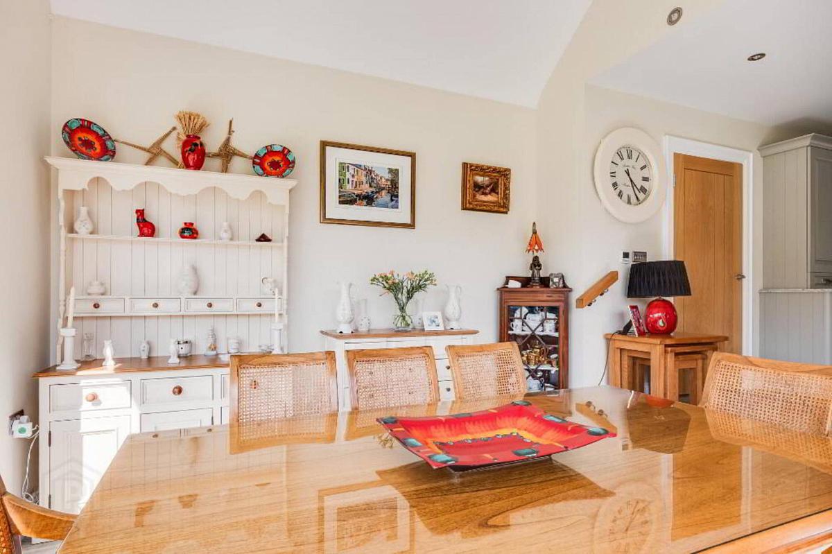 Open plan to Kitchen with step down to garden level, decorative tiled step, laminate flooring, vaulted ceiling, corner window overlooking garden & Colebrooke River.