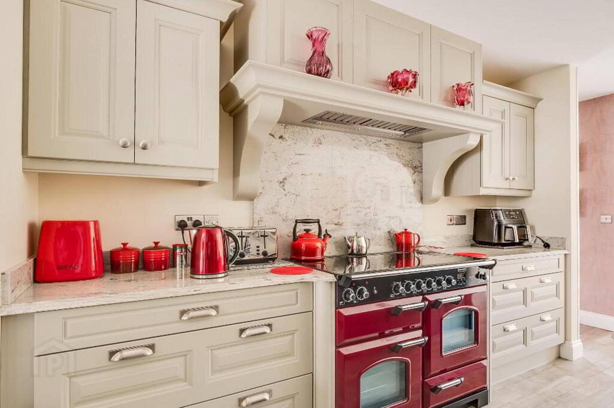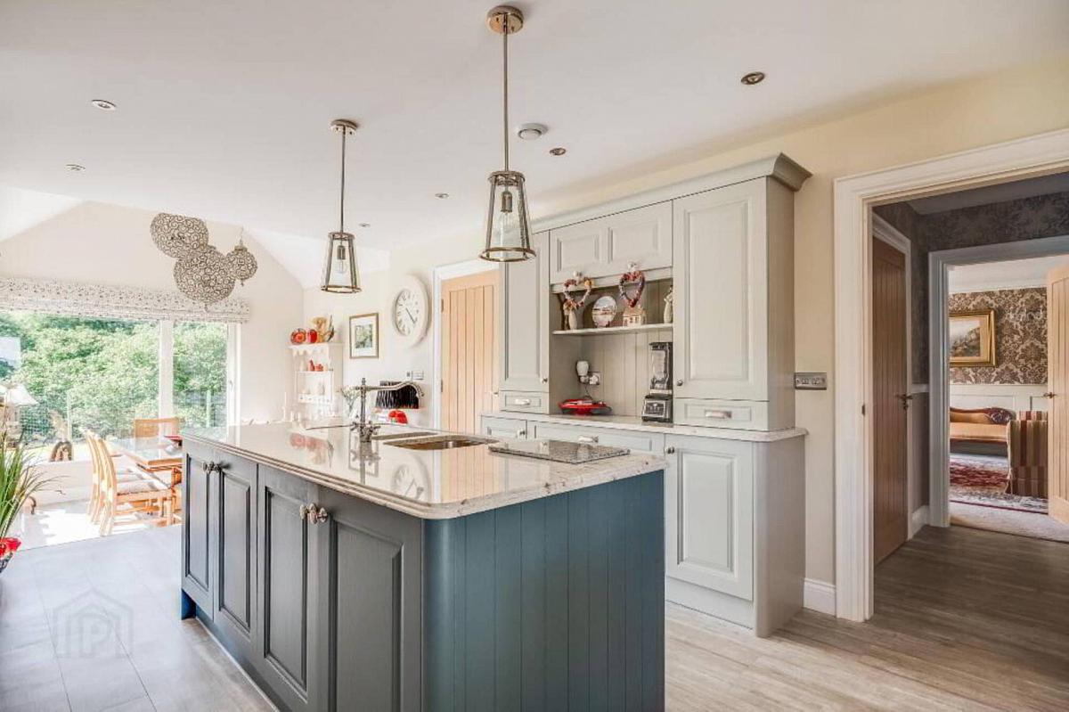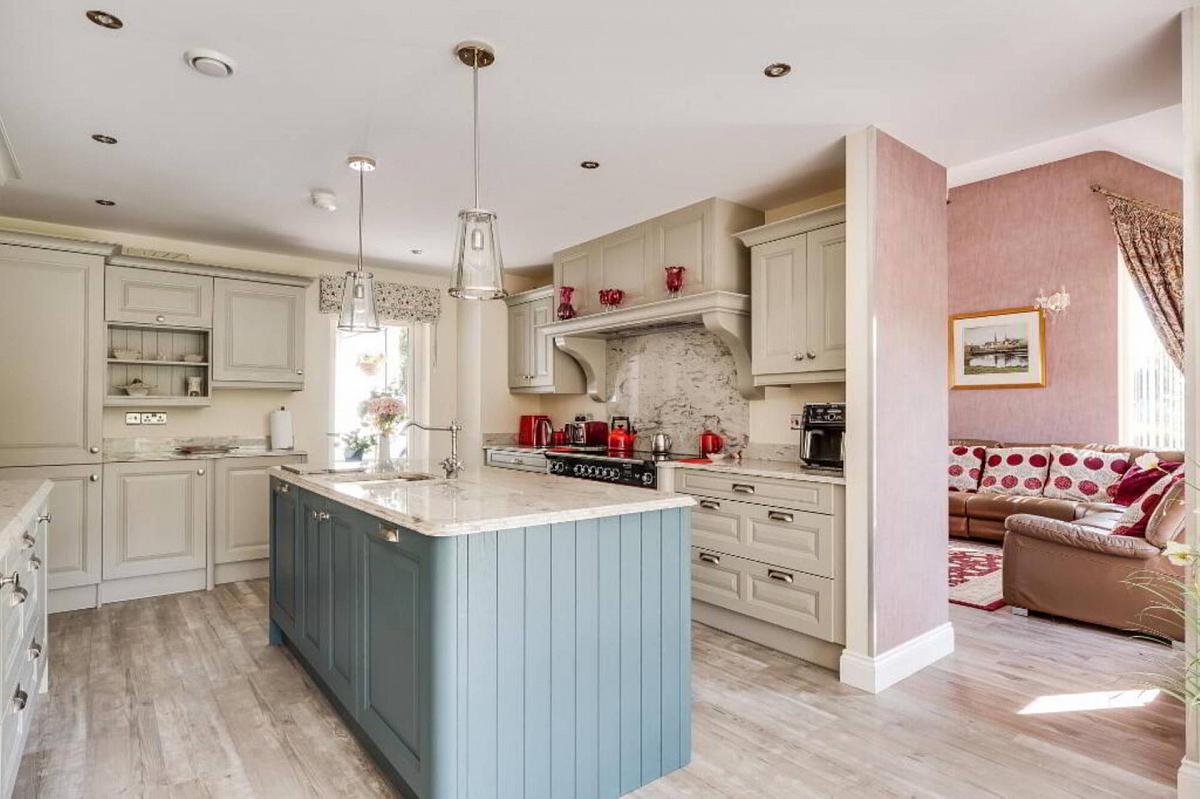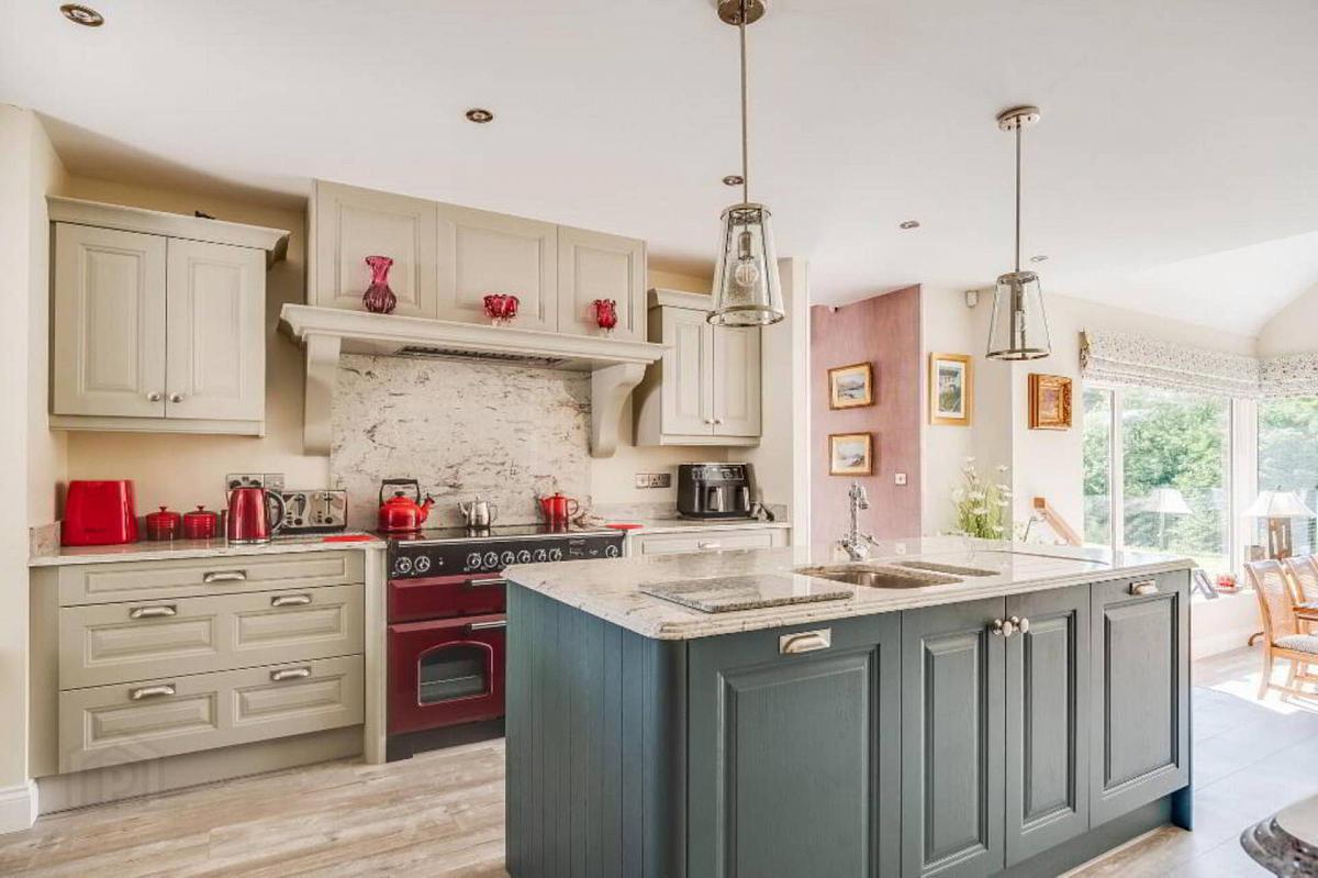 Luxury fitted kitchen with an extensive range of high & low level units including island unit & dresser, granite worktops, integrated dishwasher, fridge freezer, feature extractor fan mantle, Rangemaster' electric range cooker, stainless steel sink with granite drainer board, recessed lighting, laminate flooring.