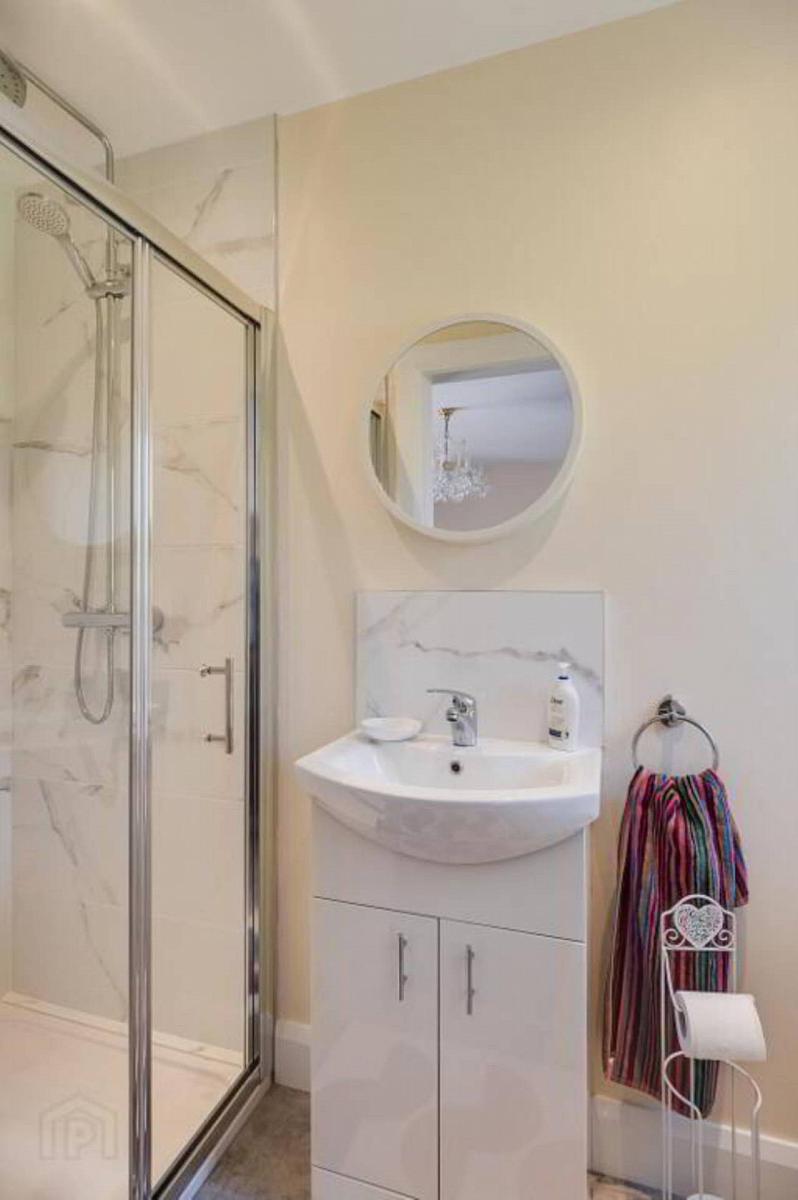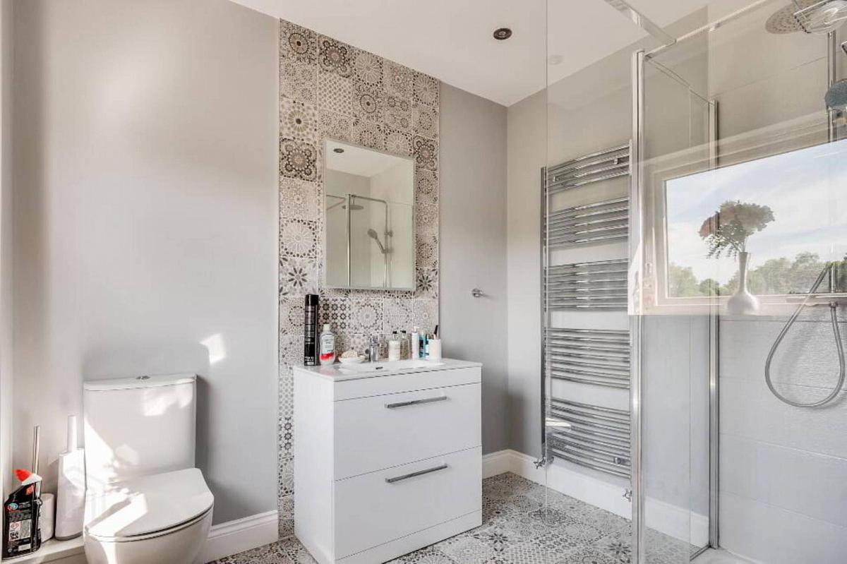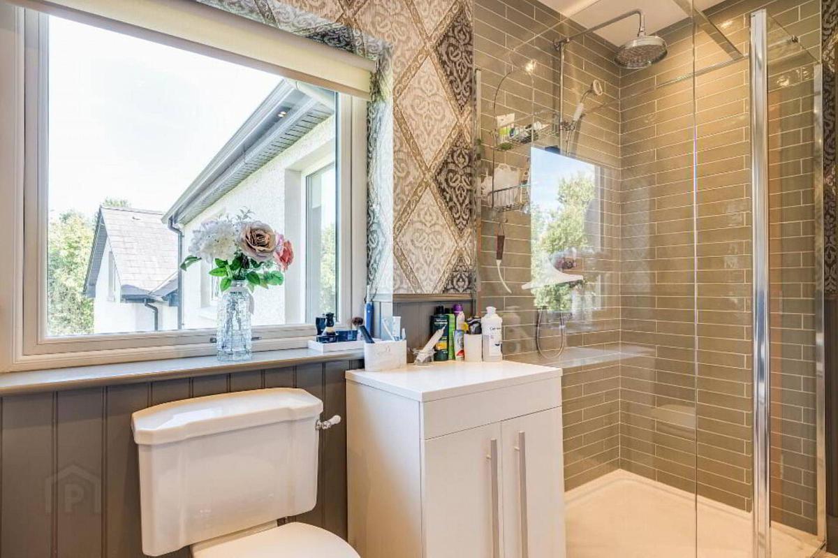 White suite, feature bath with telephone shower taps, vanity unit, step in shower cubicle with thermostatically controlled shower, decorative tiled floor, tiled splash back, recessed lighting, tongue & groove wall panelling, picture window overlooking the Colebrooke River.