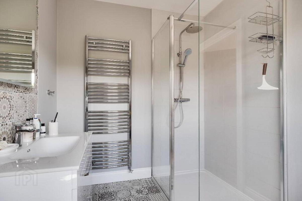 White suite, step in shower cubicle with thermostatically controlled shower, decorative tiled floor, tiled splash back, heated towel rail, recessed lighting, window overlooking the Colebrooke River.
