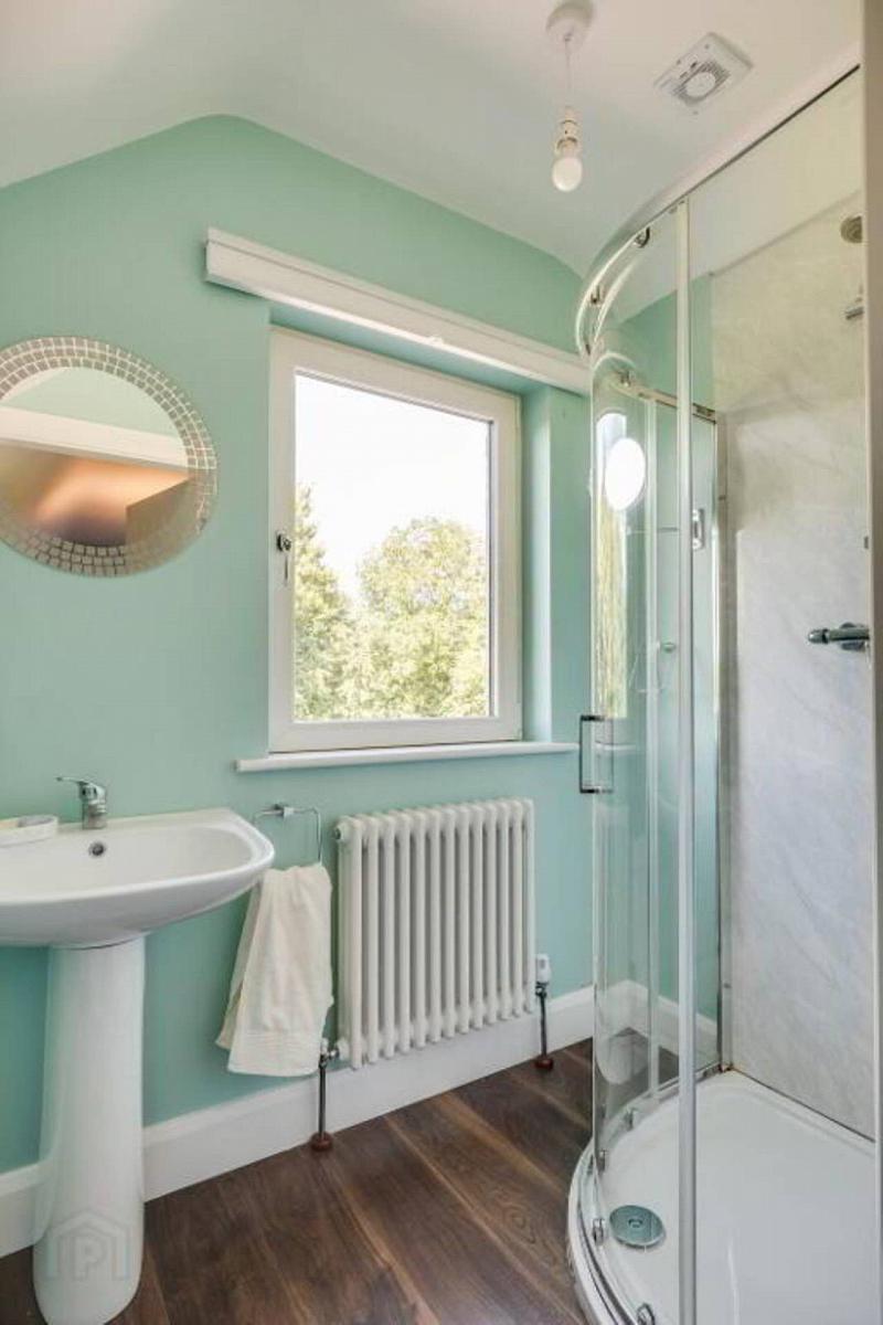 White suite, step in shower cubicle, thermostatically controlled shower, laminate flooring, PVC protective wall panelling.
