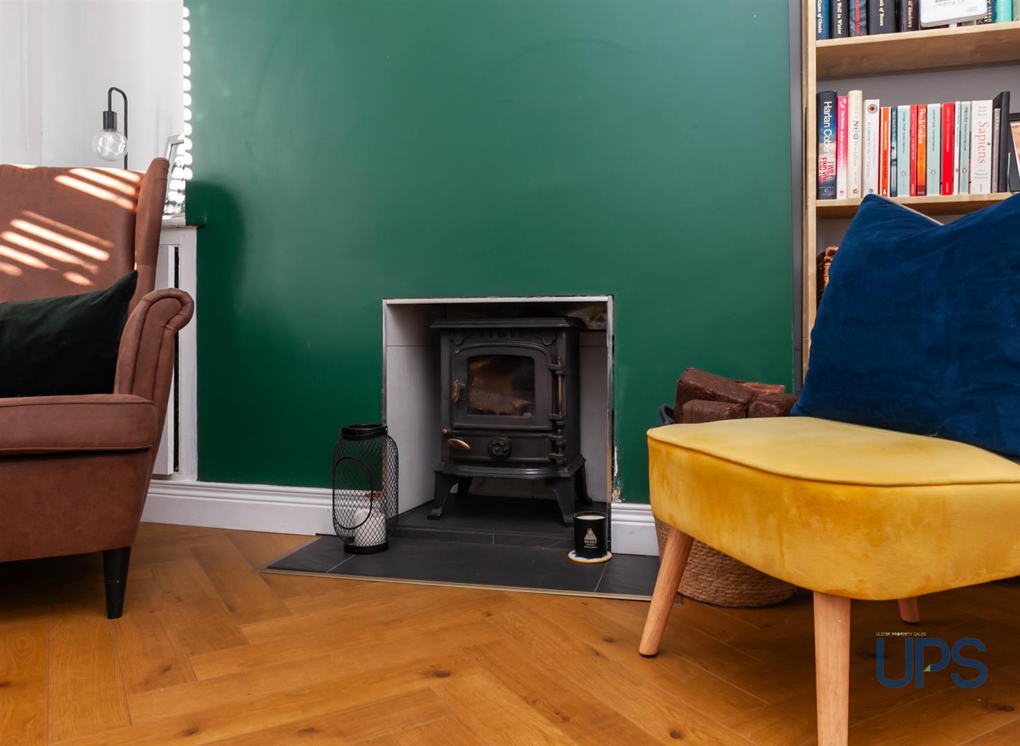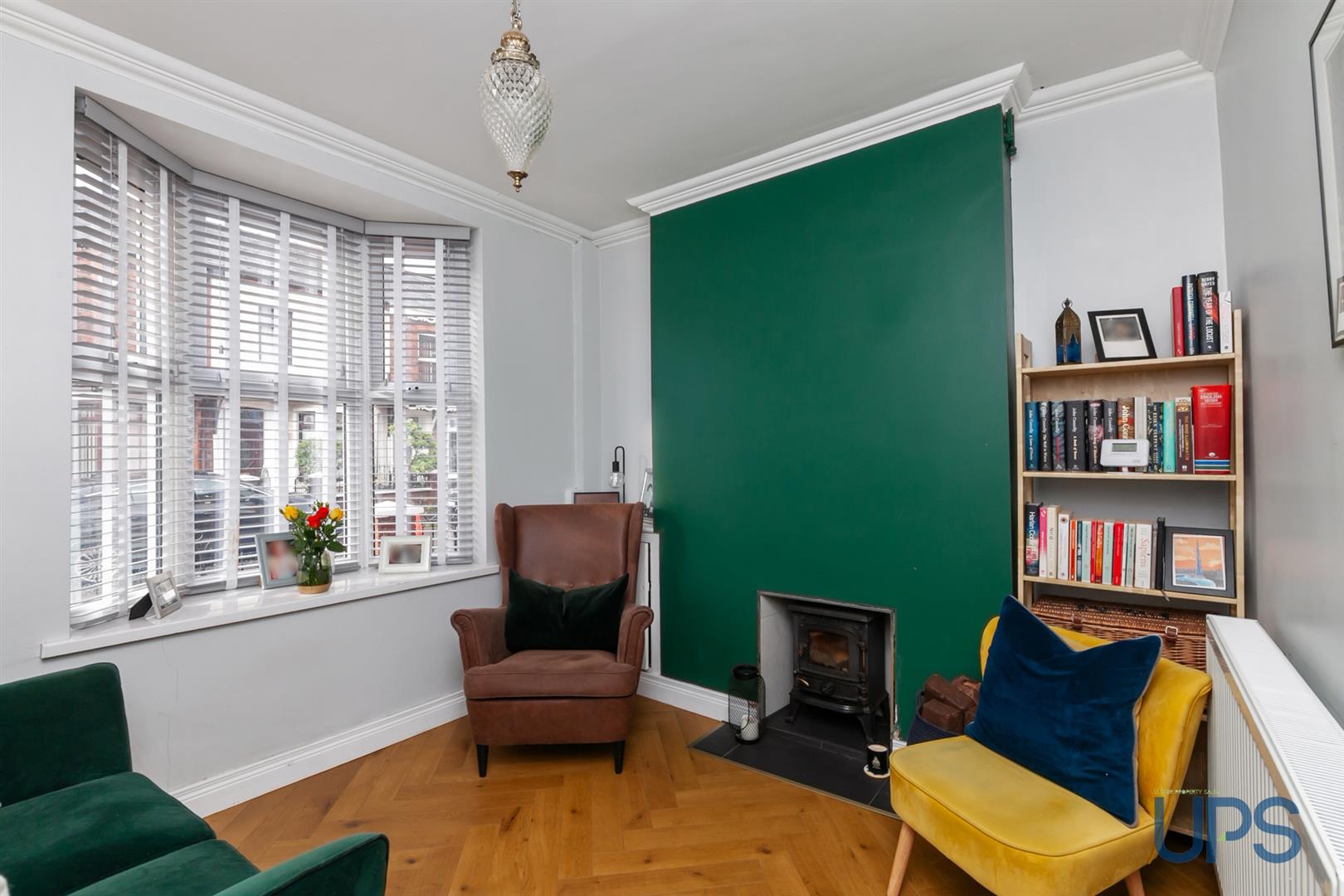 Feature fireplace with slate hearth, wood burner, bay window, feature wooden effect strip floor.