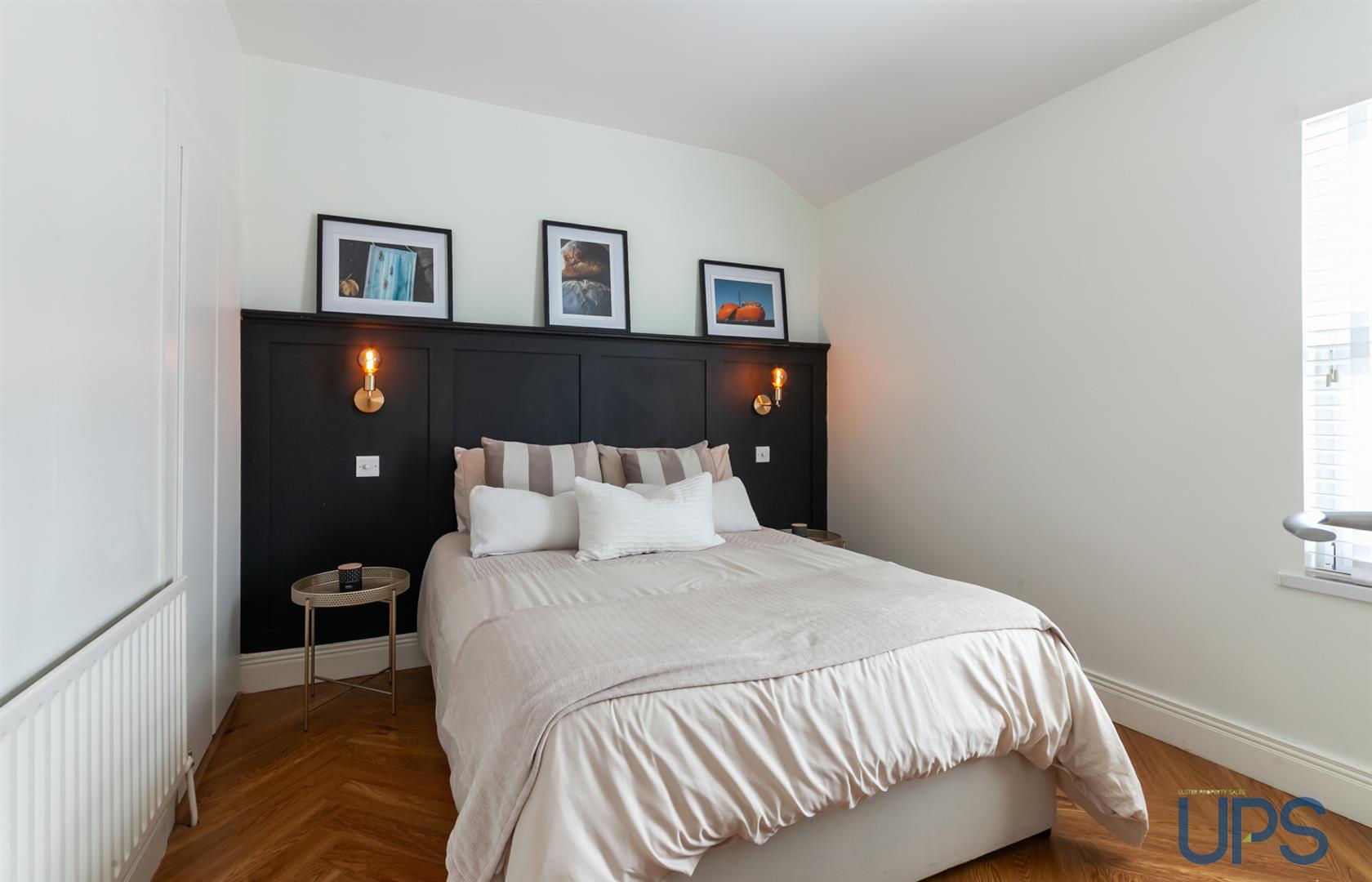 Principle bedroom with feature wall panelling.