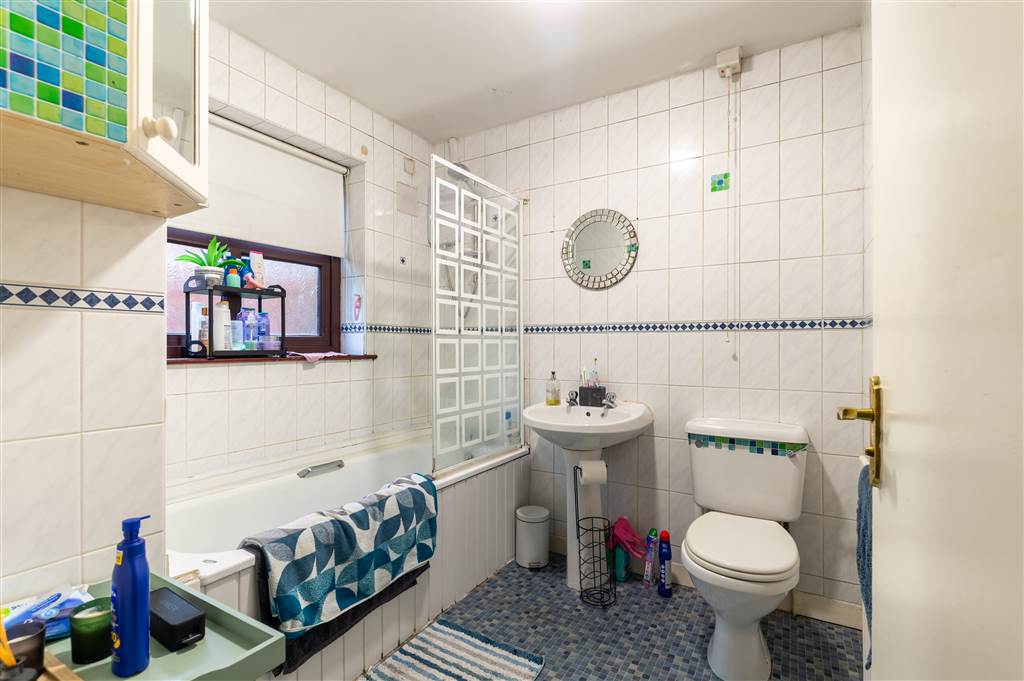 White suite comprising of panelled bath with mixer taps, electric shower, low flush w.c, wash hand basin, fully tiled walls, panelled radiator.