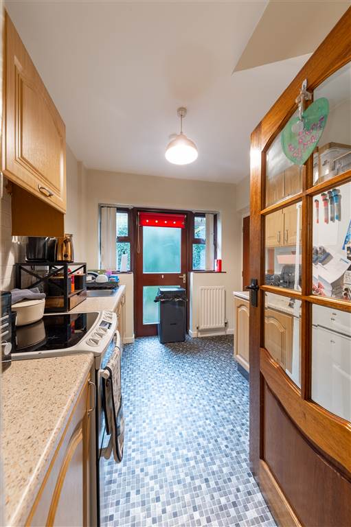 Range of high and low level units, formica work surfaces, stainless steel sink unit with mixer taps, cooker space , fridge freezer space, partly tiled walls, panelled radiator, door to rear.