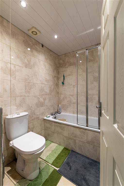 White suite comprising of tiled bath with mixer taps and accompanying thermostatic mixer bar shower, pedistal wash hand basin with mixer taps, low flush w.c, fully tiled wall and flooring, wall mounted chrome towel radiator, recessed spotlight.