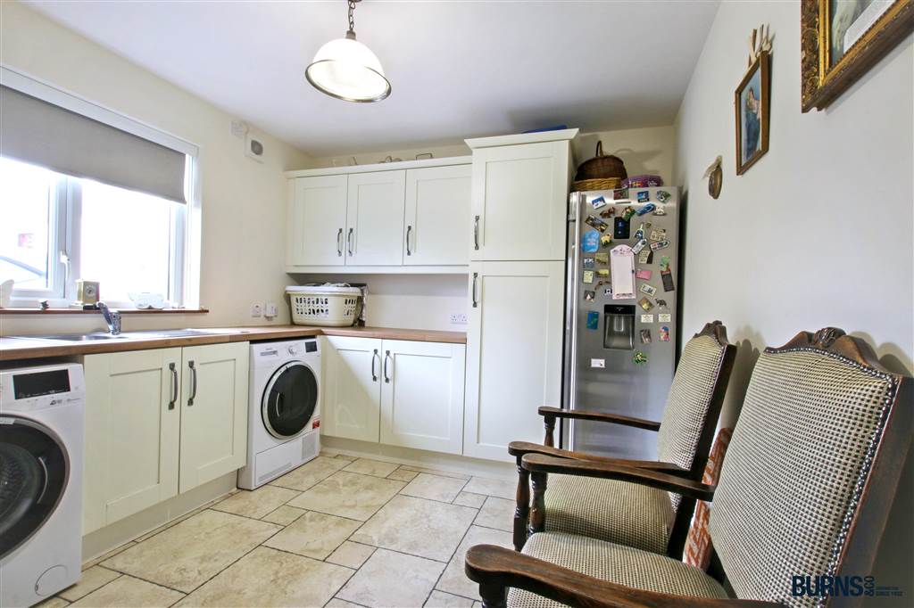 tiled floor; range of eye and low-level units; sink and drainer; plumbed for washing machine and provision left for tumble dryer; extractor fan.