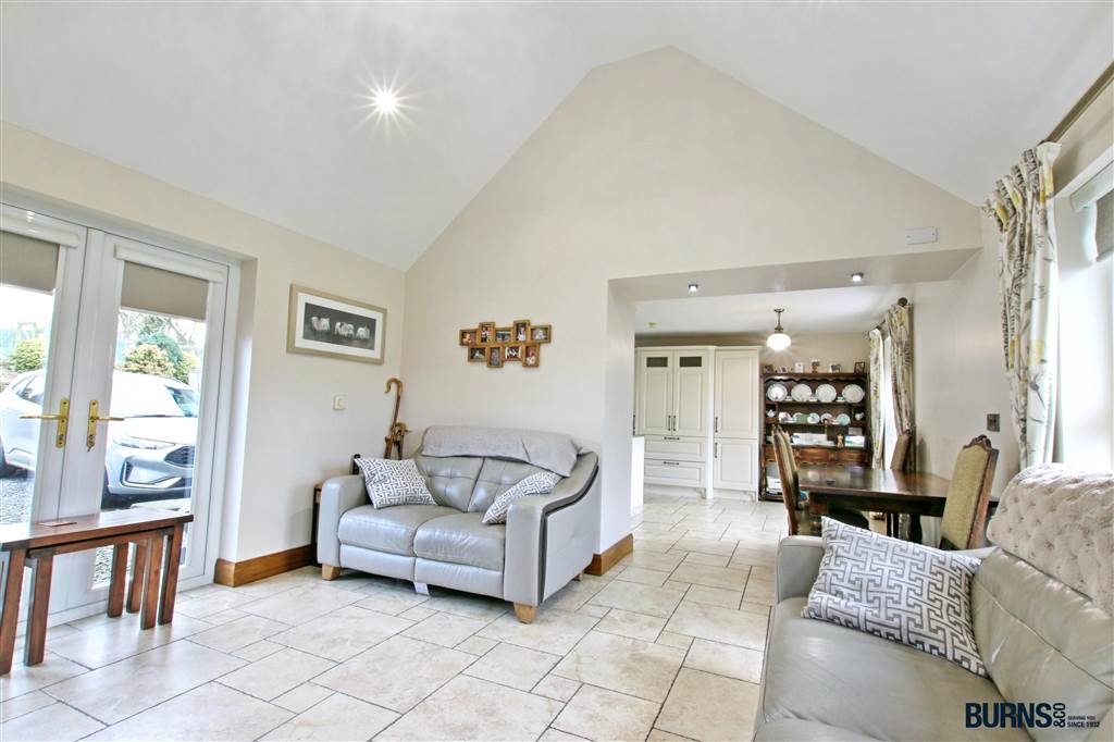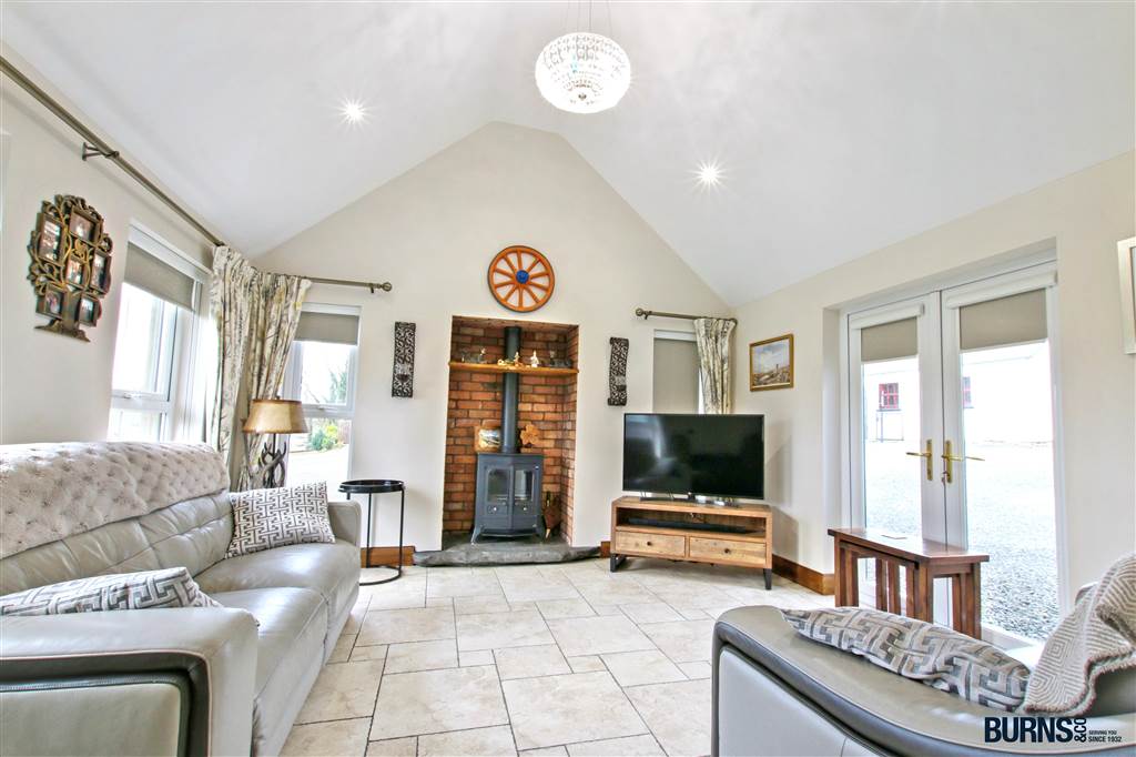 tiled floor; vaulted ceiling with recessed spotlighting; multi-fuel stove (which heats both water and radiators); TV point; double doors to rear yard and stone outbuilding.