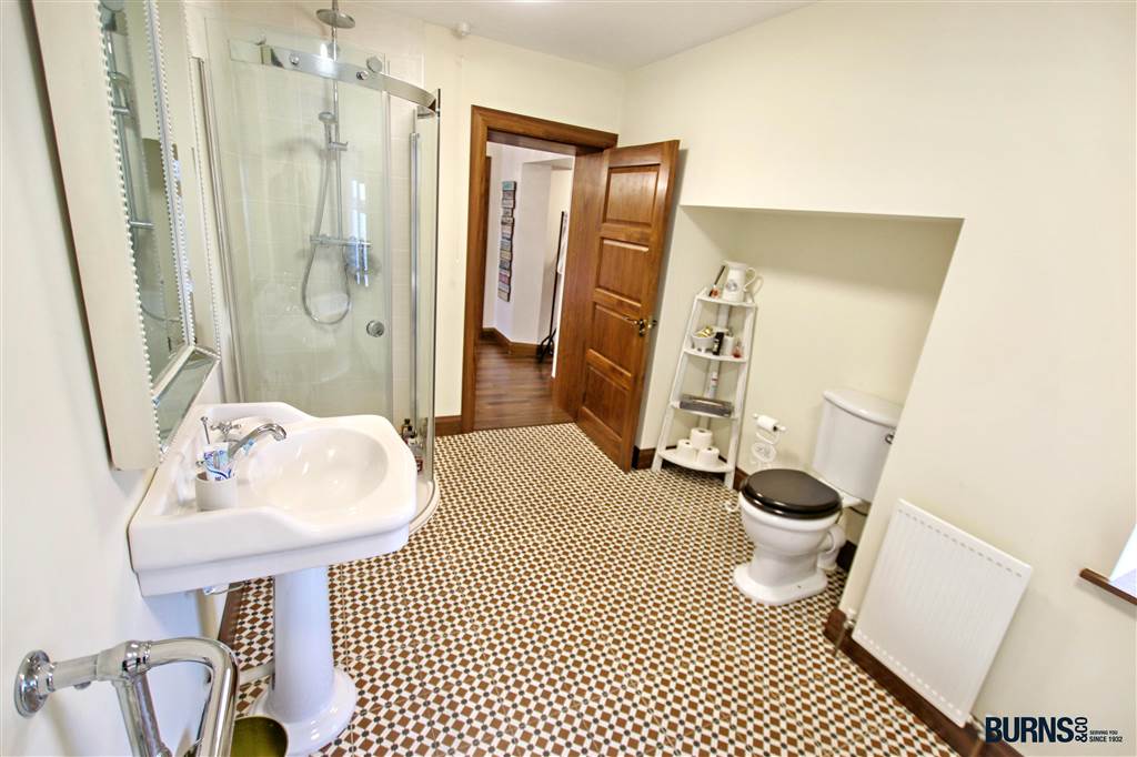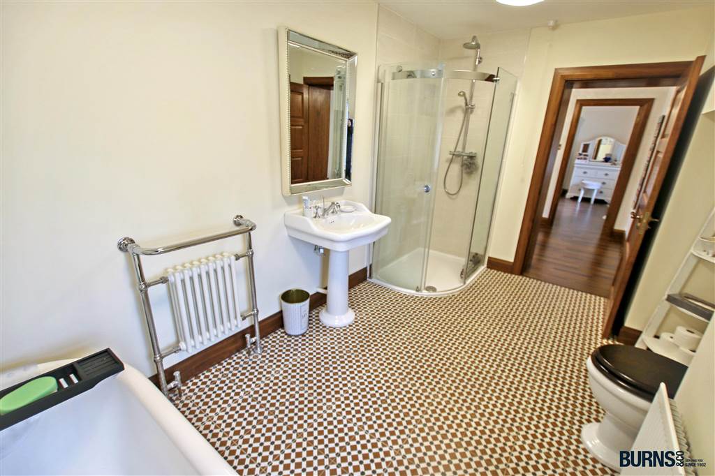 tiled floor; mains connected shower; freestanding bath; cast iron radiator with chrome towel rail; wash hand basin; toilet.