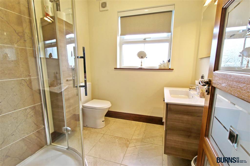 tiled floor; mains connected shower; toilet; wall-hung wash hand basin with storage cupboards; wall-mounted mirror with overhead light; heated chrome towel rail; extractor fan.