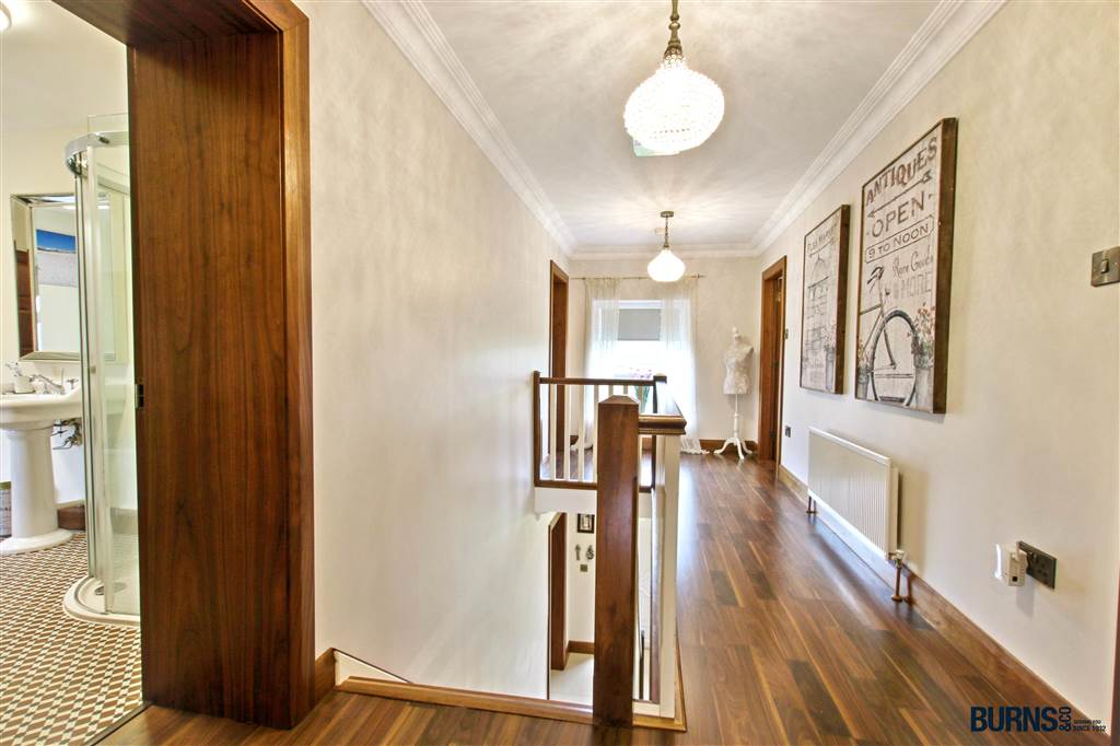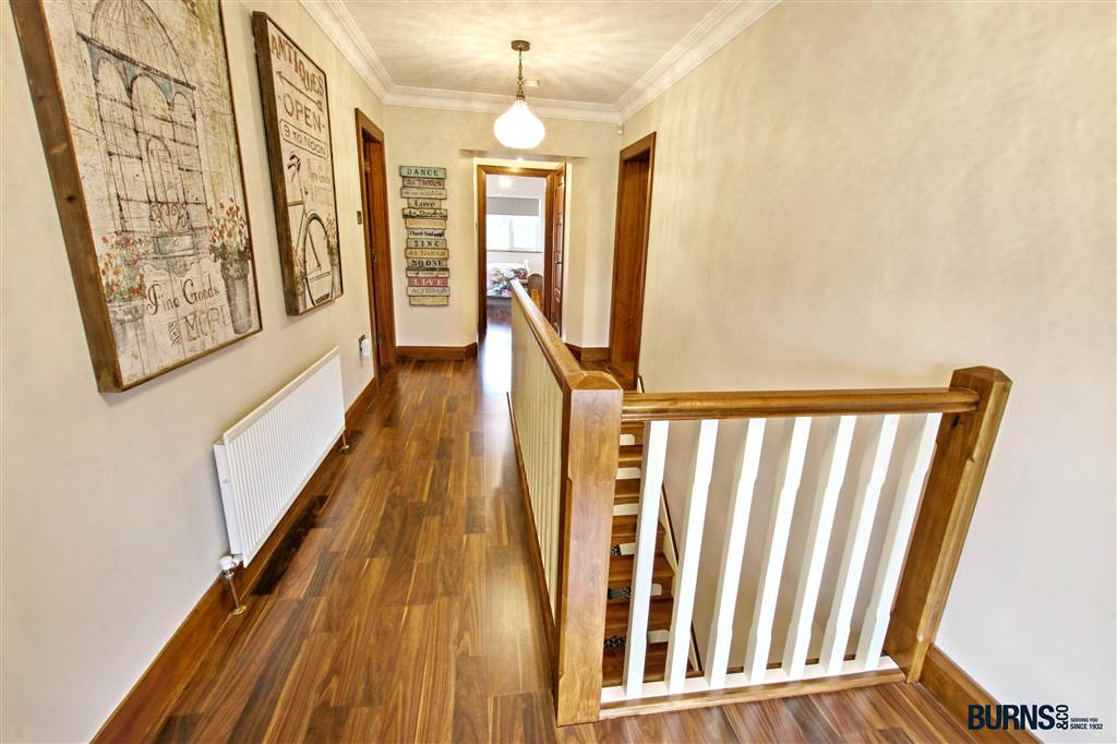 solid wooden staircase; laminate flooring to landing; coving; mechanical ventilation point.