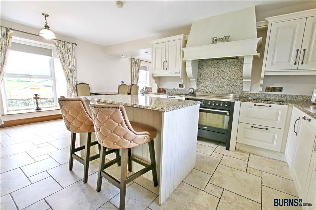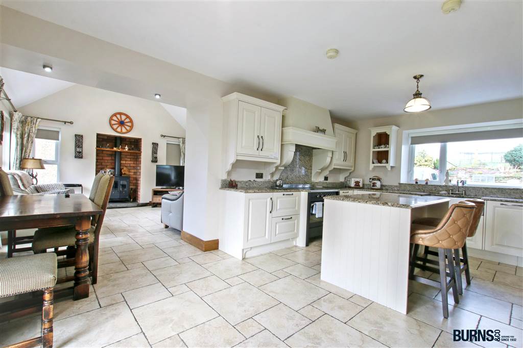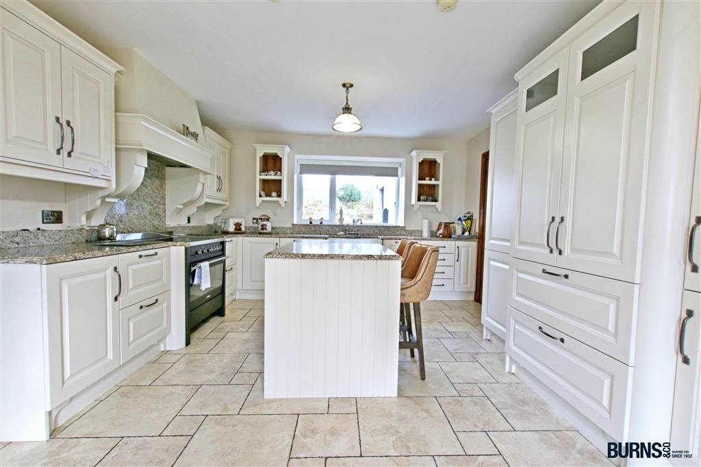 attractive and modern country style kitchen with eye and low-level units; granite worktops, sills and splashback; electric oven, grill and hob with extractor hood; double Belfast sink; integrated dishwasher; integrated bin cupboard; integrated fridge; integrated freezer; featured central island with breakfast bar and granite worktop.
