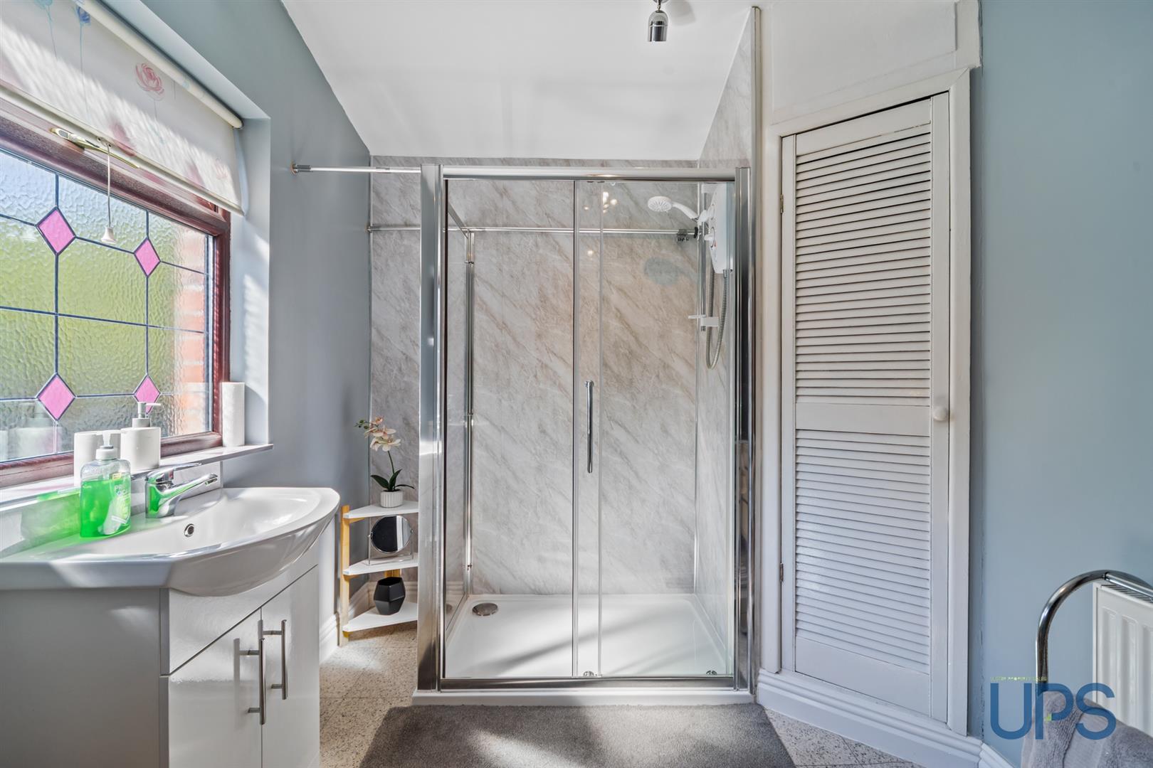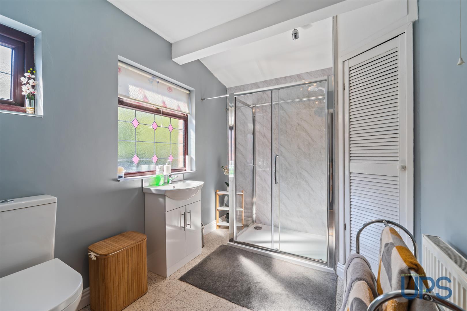 Feature white shower enclosure, electric shower unit, wash hand basin, vanity unit, low flush Wc.