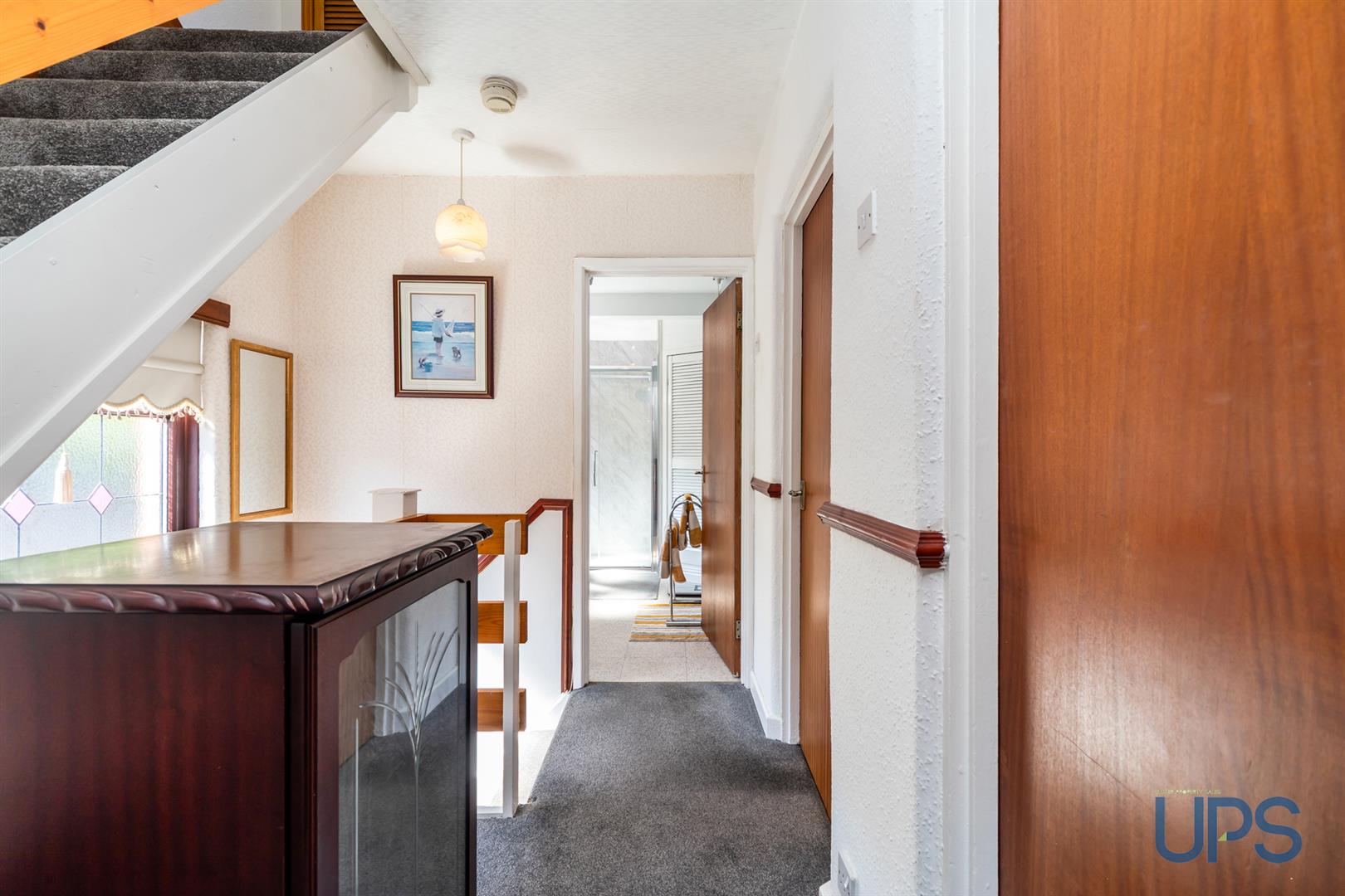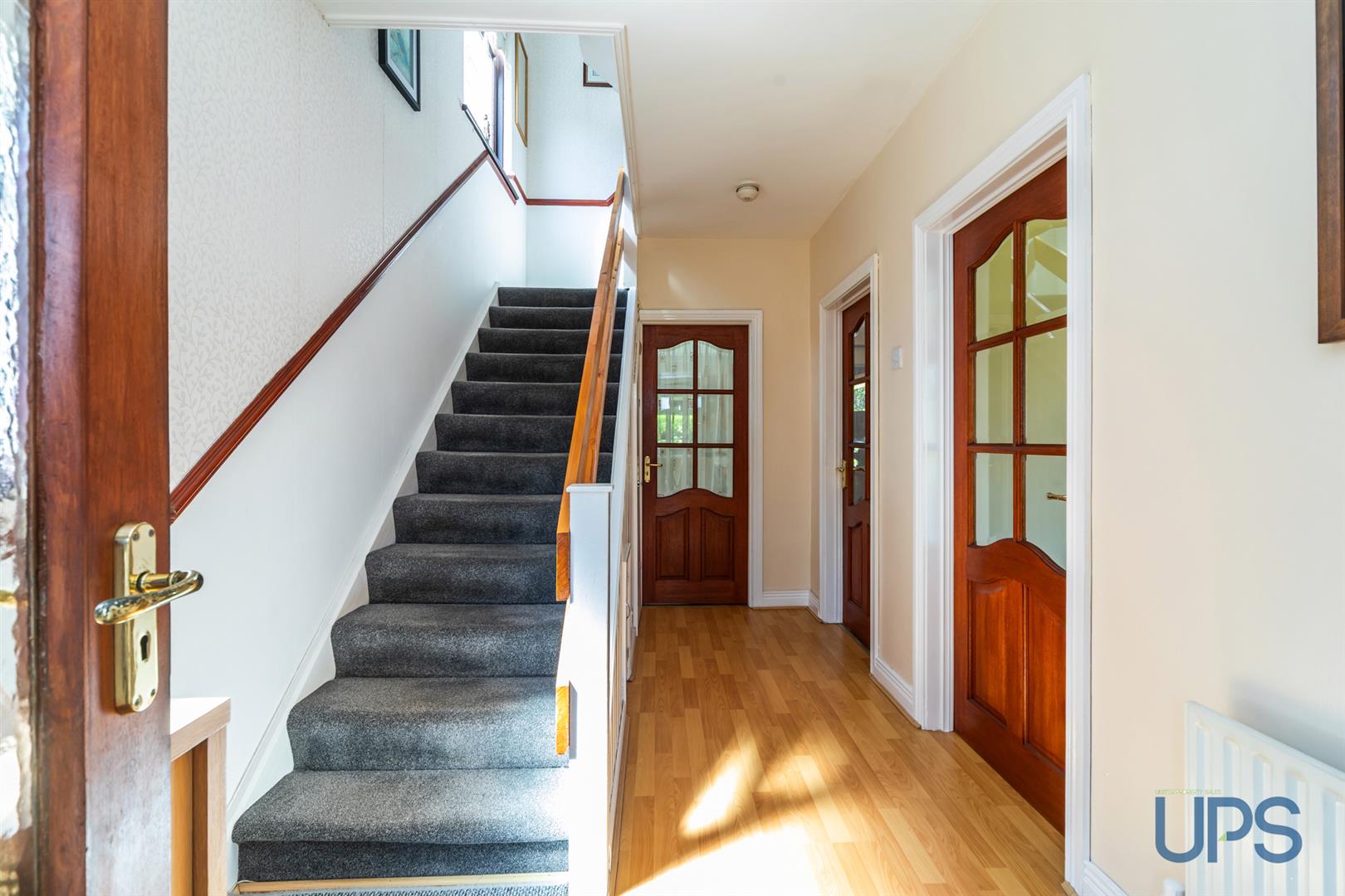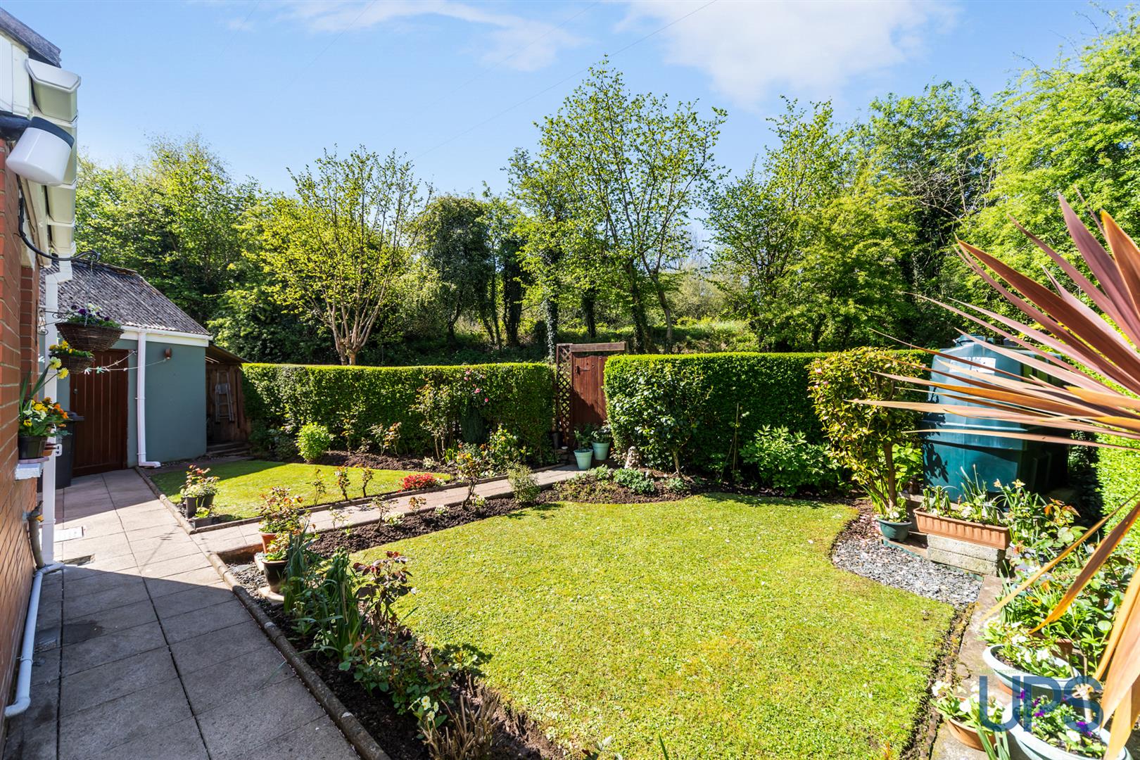 Driveway with car parking front and side, mature landscaped gardens in neat lawns, hedging and well stocked flowerbeds, feature flagging and fencing. Housed oil fired boiler. Outside light and tap.