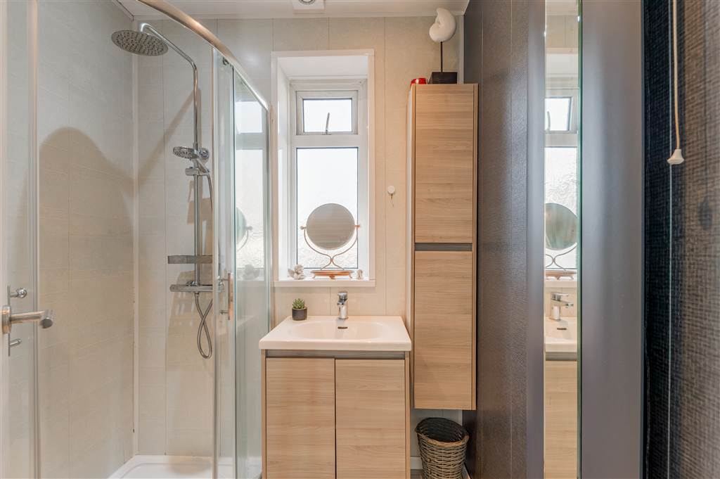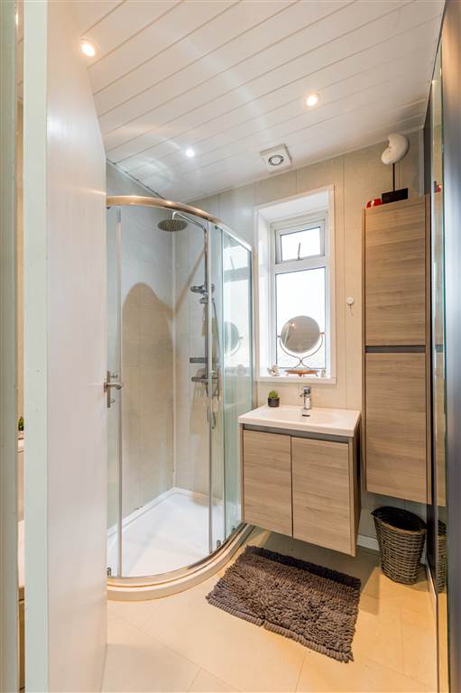 White suite comprising of shower enclosure and waterfall shower, wash hand basin with mixer taps and vanity unit, low flush w.c, recessed spotlighting, extractor fan, wall mounted radiator.