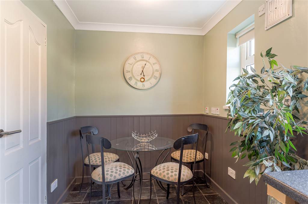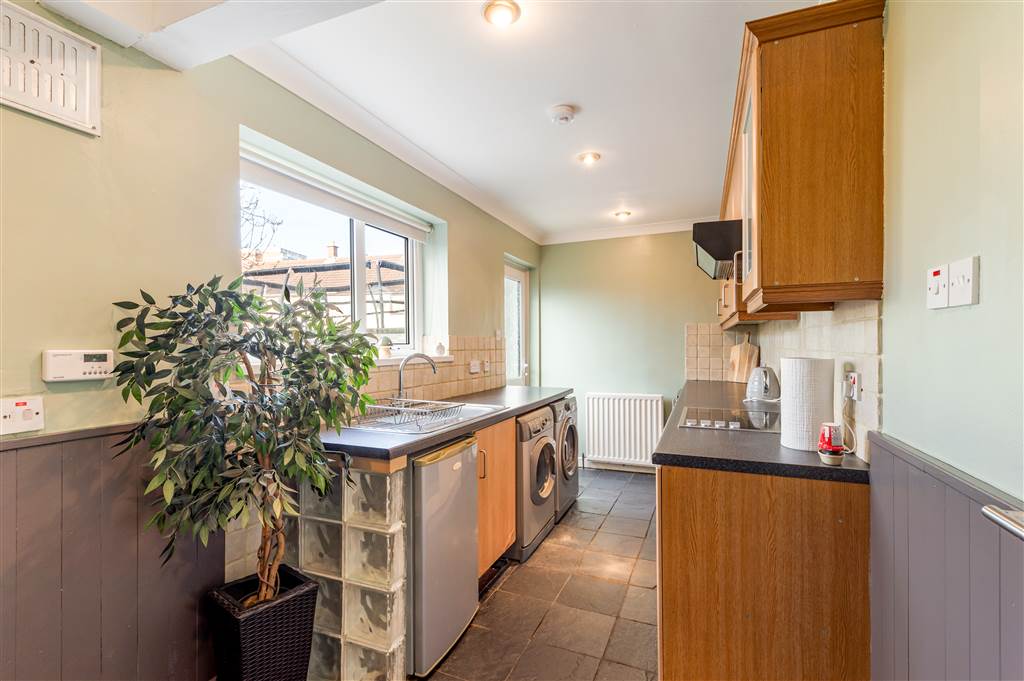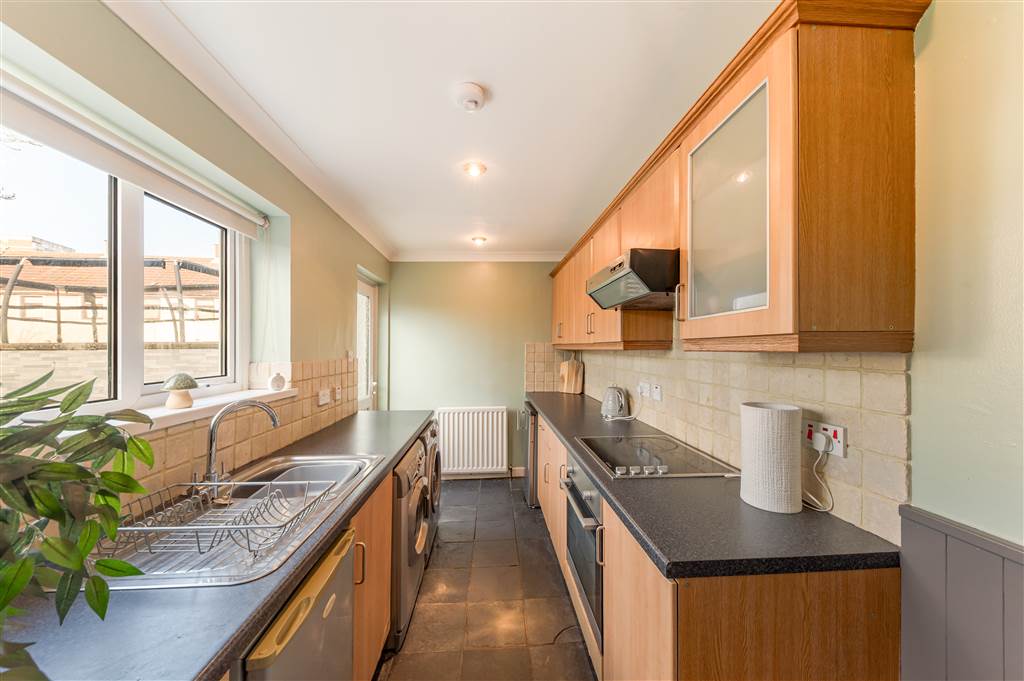 Range of high and low level units, formica work surfaces, stainless steel sink unit with mixer taps, 4 ring ceramic hob and electric oven, plumbed for washing machine, tumble dryer space, under counter fridge, under counter freezer space, extractor fan, recessed spotlighting, partly tiled walls, ceramic tiled flooring, cornice ceiling, space for casual dining.