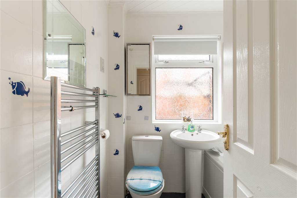 White suite comprising of panelled bath/ shower with mixer taps, low flush w.c, fully tiled walls, ceramic tile flooring.