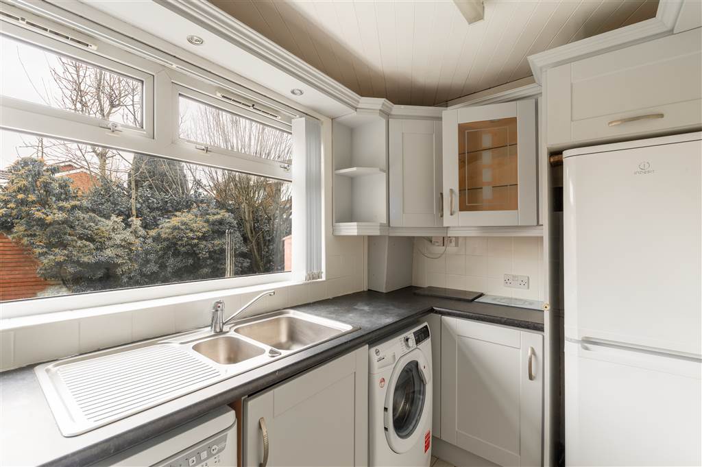 Range of high and low level units, formica work surfaces, stainless steel sink unit with mixer taps, 4 ring gas hob and electric oven, extractor fan, plumbed for washing machine, dishwasher space, fridge freezer space, partly tiled walls, ceramic tile flooring.