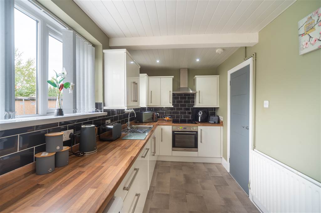 Good range of high & low level units, 4 ring electric hob & integrated oven, stainless steel extractor fan, integrated fridge/freezer & dishwasher, plumbed for washing machine, double panelled radiator, recessed spot lighting.