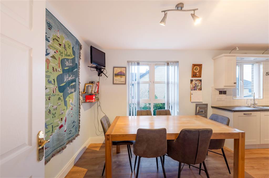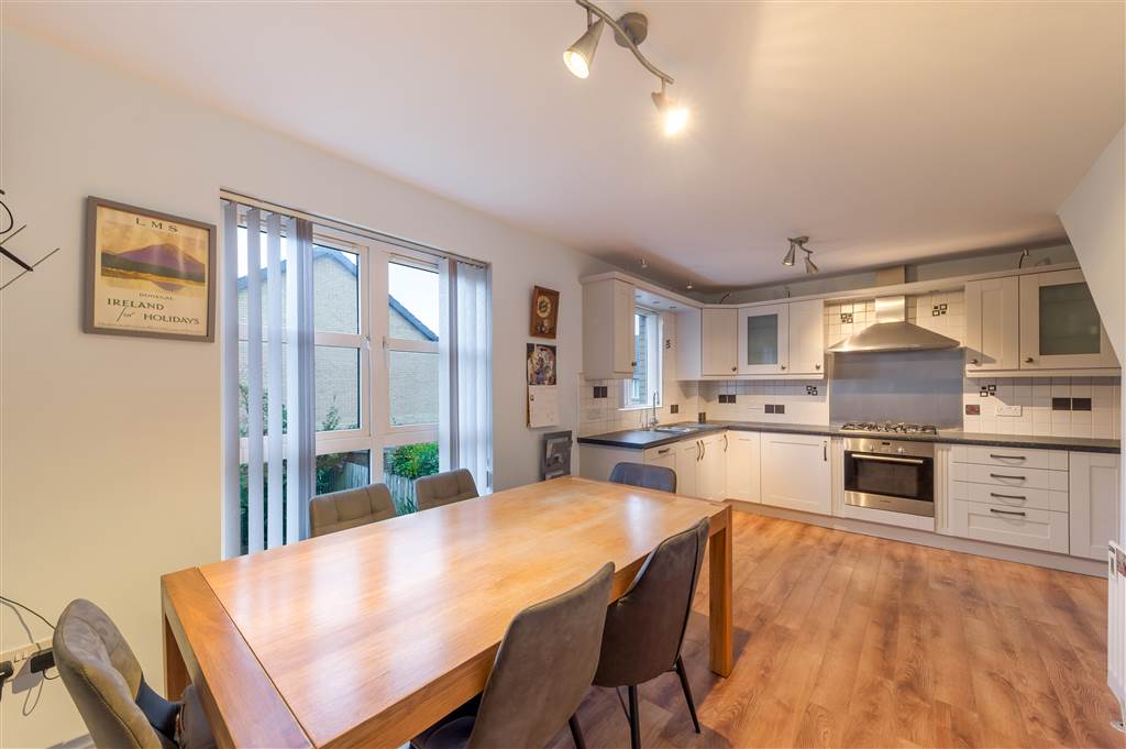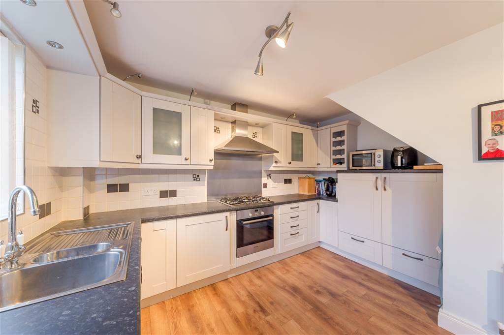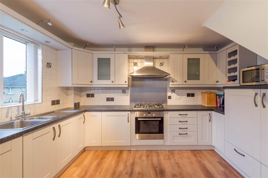 Excellent range of high and low level units, Formica work surfaces, stainless steel sink unit with mixer taps, 5 ring gas hob & electric oven, stainless steel extractor fan, integrated dishwasher, integrated fridge / freezer, partly tiled walls, laminate wood flooring, double panelled radiator, space for dining.