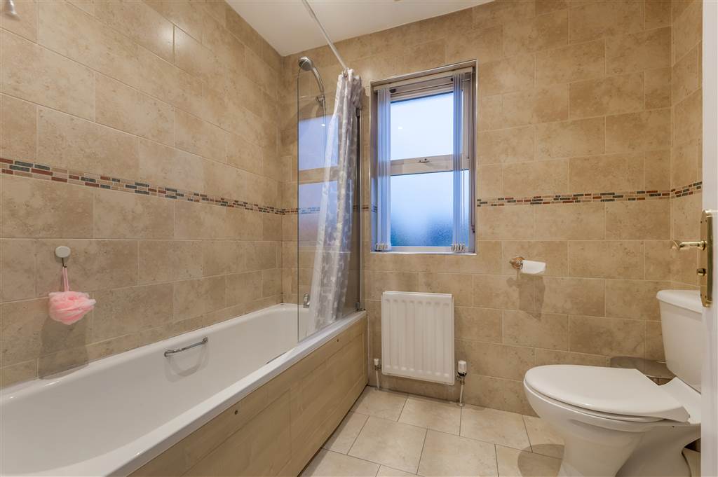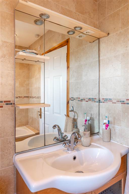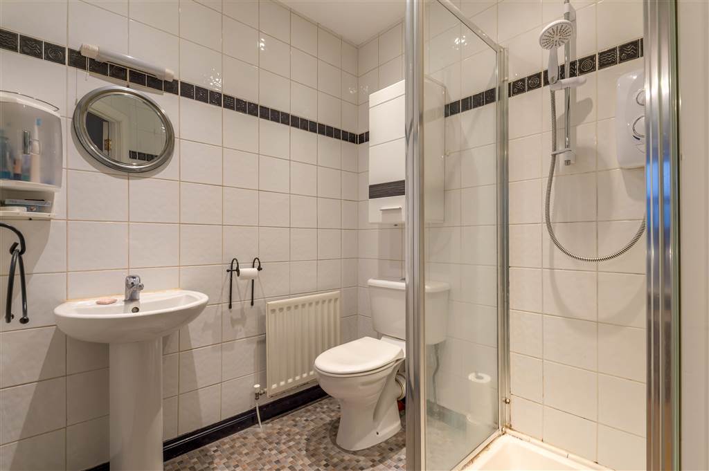 Shower enclosure with electric shower, low flush W.C, pedestal wash hand basin with mixer taps, fully tiled walls, recessed spot lighting, extractor fan, panelled radiator.