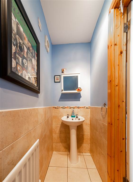 Low flush W.C, pedestal wash hand basin, partly tiled walls, ceramic tiled floor, panelled radiator, extractor fan.