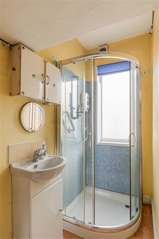 White suite comprising of shower enclosure, wash hand basin with mixer taps, vanity unit, low flush w.c, recess spotlight, extractor fan, ceramic tile flooring.
