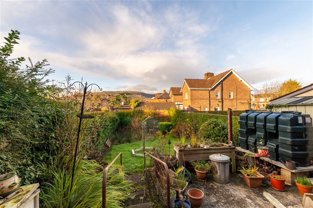 To the rear: Extensive garden laid in lawn with mature shrubs & hedging, outside light & tap.