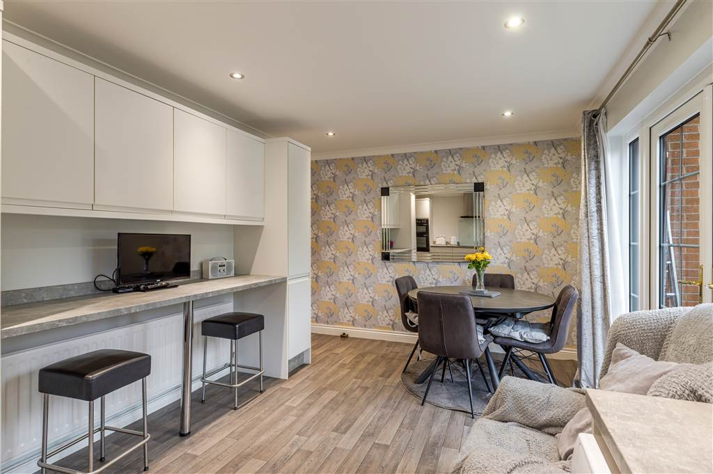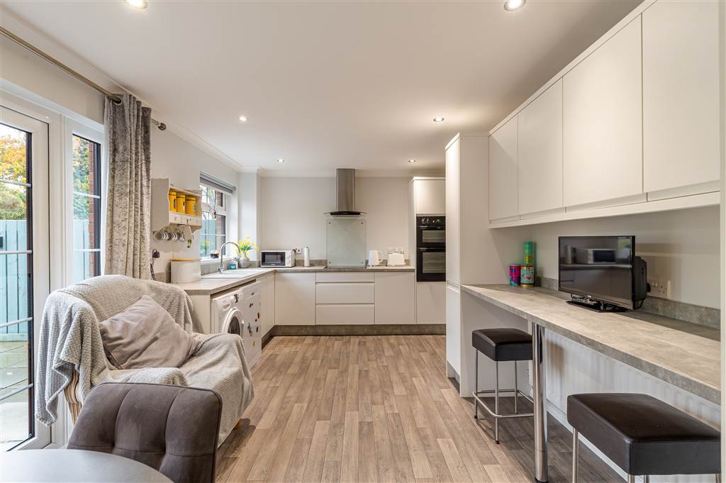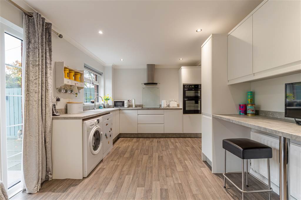 Excellent range of high and low level units, Formica work surfaces & splash back, sink unit with mixer taps, 4 ring ceramic hob & built in electric oven, plumbed for washing machine, space for dishwasher, breakfast bar, double panelled radiator, cornice ceiling, recessed spot lighting, understair storage with fridge / freezer space, patio doors to rear.