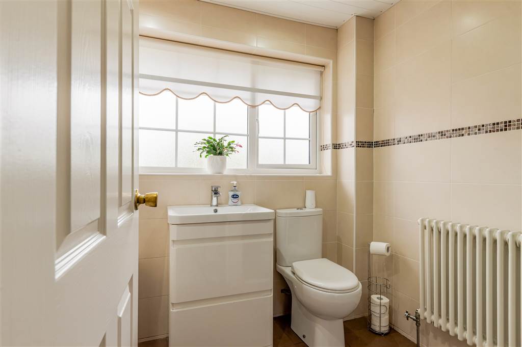 White suite comprising of panelled bath with mixer taps, wash hand basin with mixer taps & vanity unit, shower enclosure with waterfall shower head, fully tiled walls, ceramic tiled flooring, panelled radiator, recessed spot lighting.