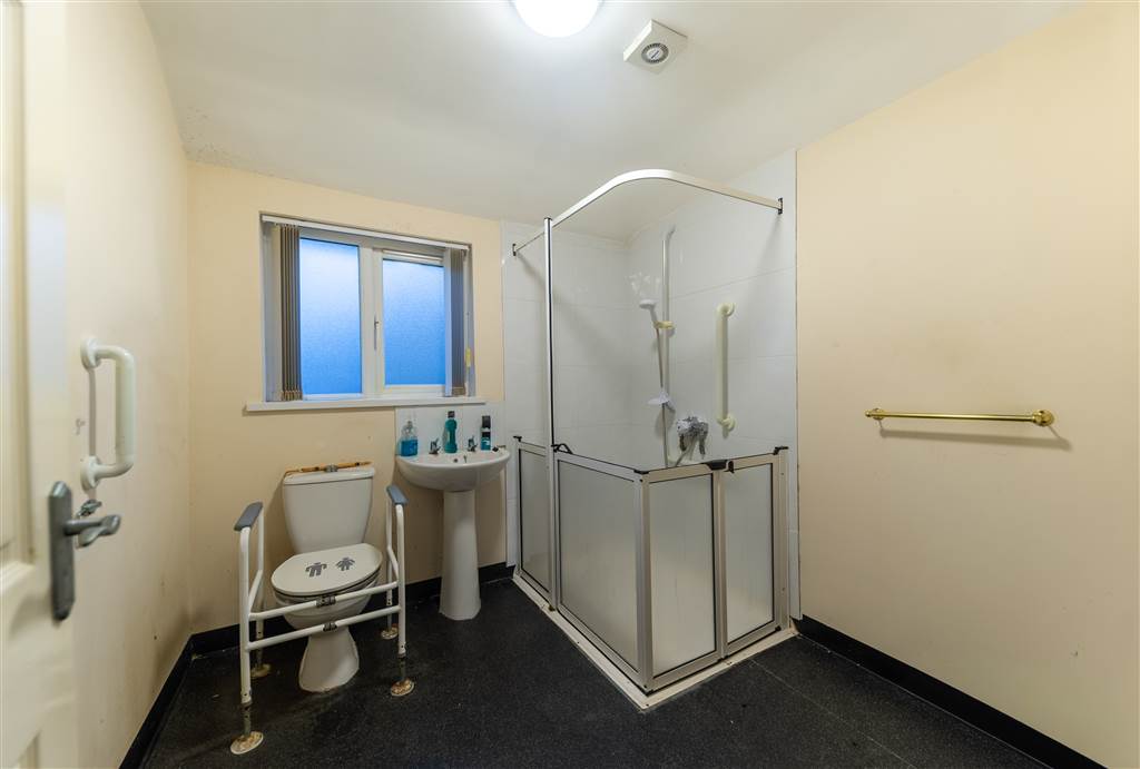 Shower enclosure, low flush w.c, wash hand basin, partly tiled walls, extractor fan.