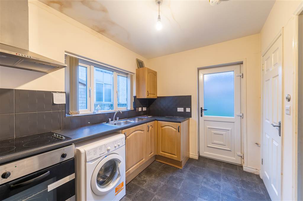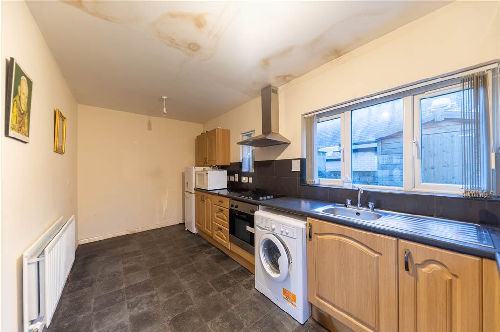 Range of high and low level units, formica work surfaces, stainless steel sink unit with mixer taps, 4 ring ceramic hob and electric oven, stainless steel extractor fan, fridge freezer space, plumbed for washing machine, recess spotlight, partly tiled walls, double panelled radiator.