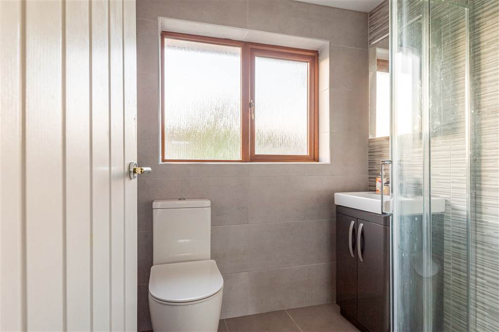 White suite comprising of shower enclosure, wash hand basin with mixer taps, low flush w.c, extractor fan, towel rail, fully tiled walls, ceramic tile flooring.