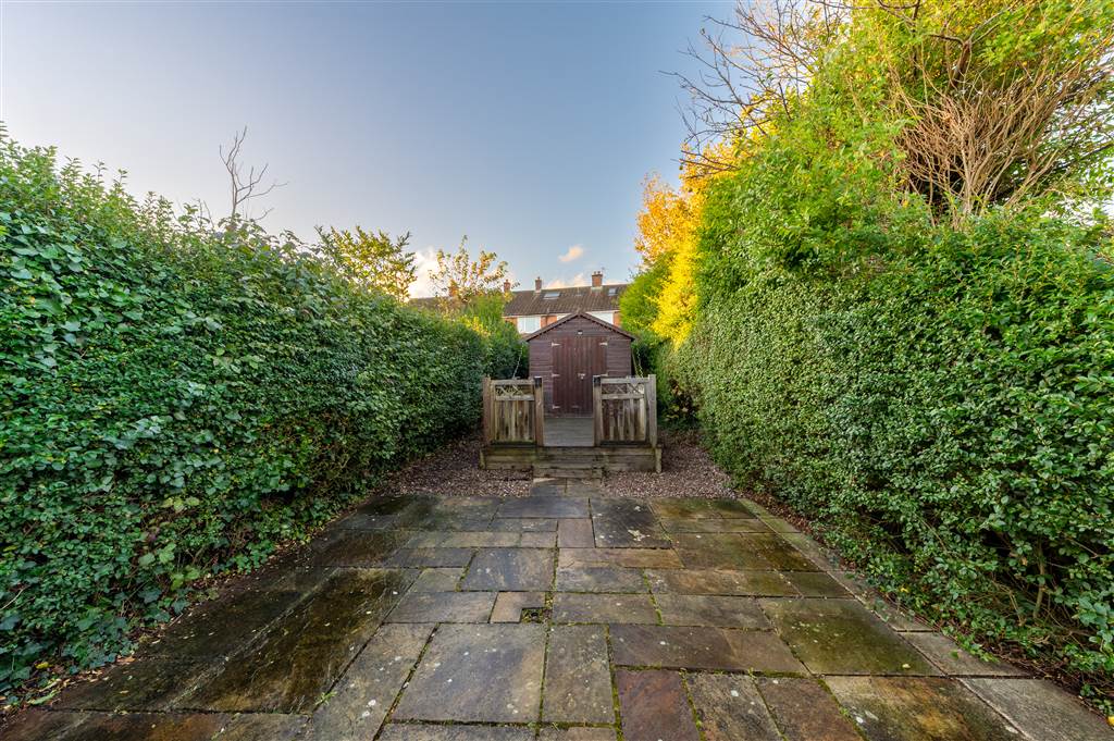 To the rear: Raised patio, stones, mature shrubs & trees, shed, oil fired central heating boiler.