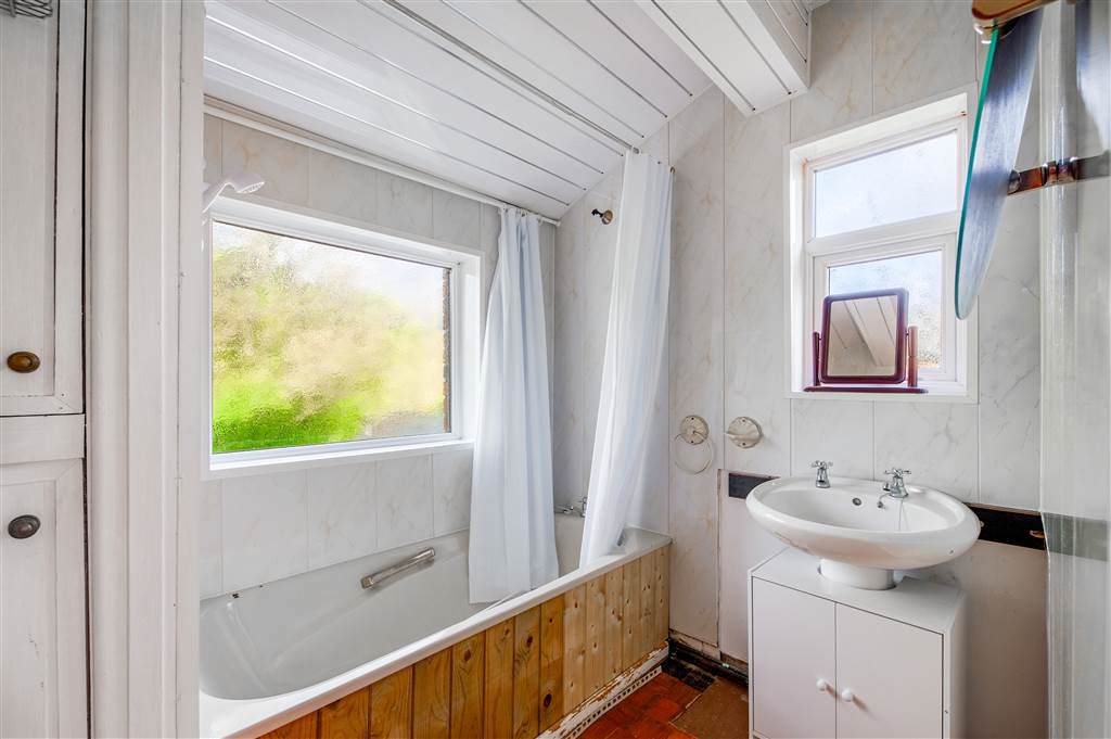 White suite comprising of panelled bath, wash hand basin , PVC tiled walls.