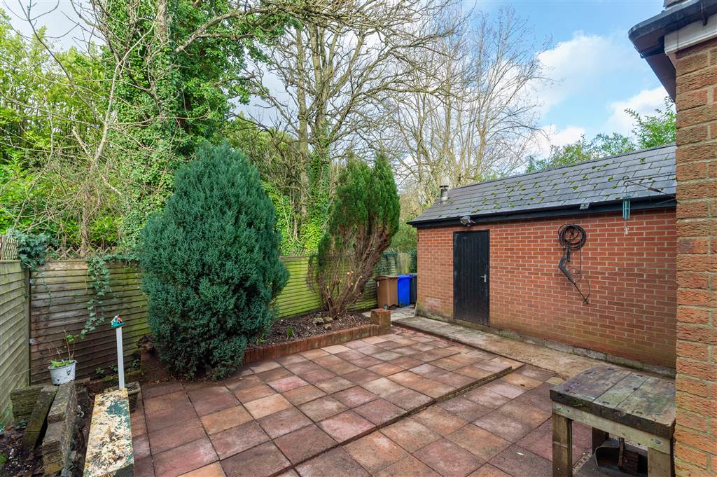 To the rear: Private enclosed paved garden, mature shrubs and trees, oil tank, outside light.