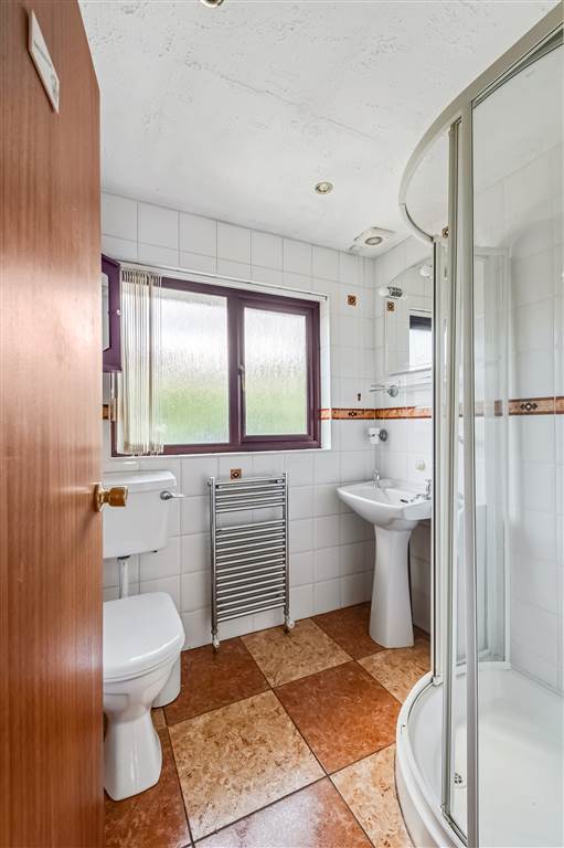 White suite comprising of shower enclosure, wash hand basin with mixer taps, low flush w.c, recessed spotlight, ceramic tile flooring, fully tiled walls.