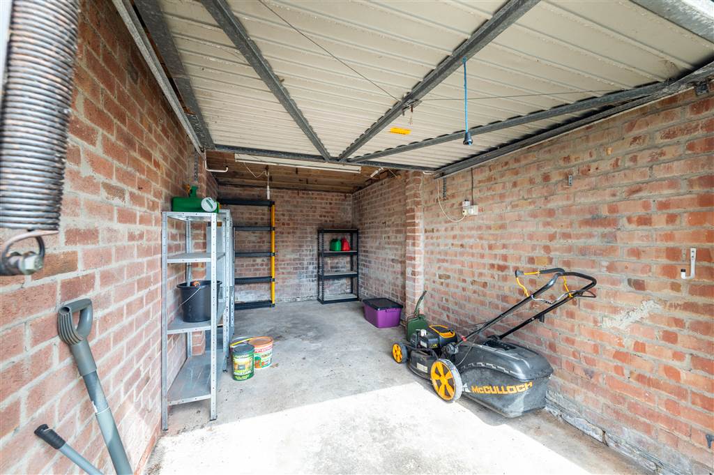 To the front: Easily maintained front garden, driveway for off street parking and garage.