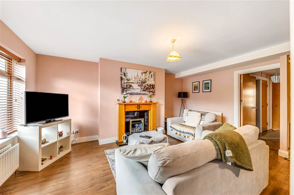 Attractive fireplace with gas fire & wood surround tiled inset and hearth, laminate wood flooring, double panelled radiator x2.