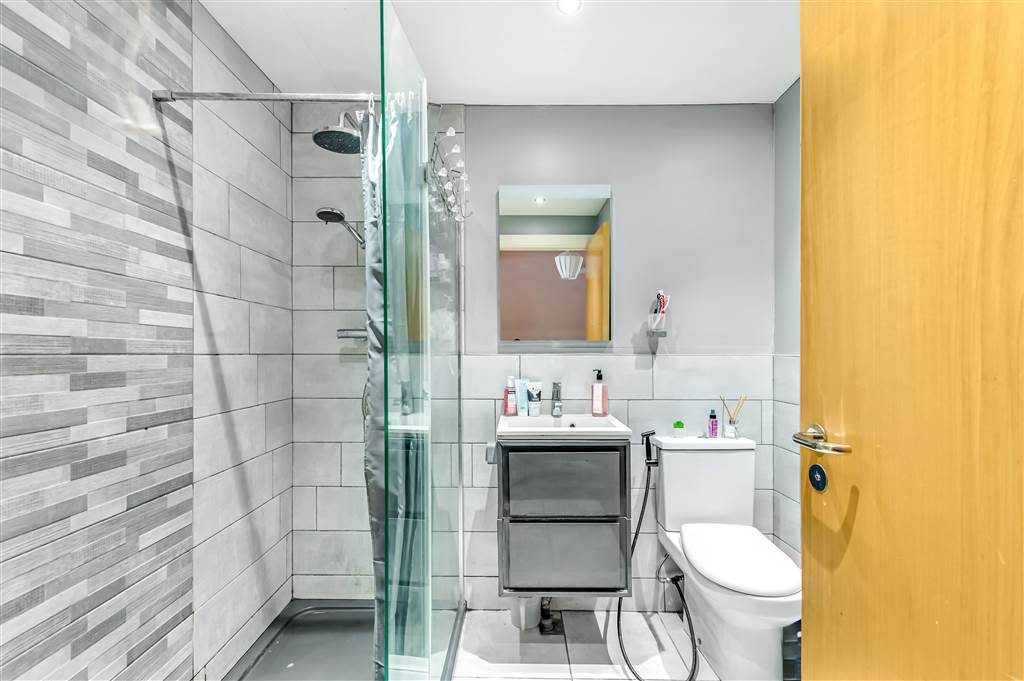 White suite comprising of shower enclosure with waterfall shower head, wash hand basin with mixer taps & vanity unit, ceramic tile flooring, fully tiled walls, chrome towel radiator, recessed spot lighting.