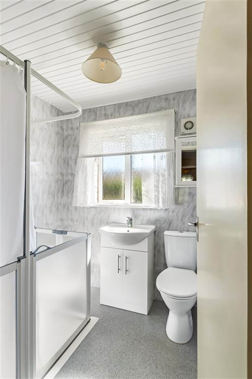White suite comprising of showe enclosure with Triton electric shower, wash hand basin with mixer taps, low flush W.C, PVC panelled walls.