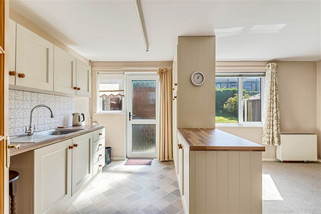 Excellent range of high and low level units, Formica work surfaces, stainless steel sink unit with mixer taps, cooker space, plumed for washing machine, part tiled walls, open to dining area.