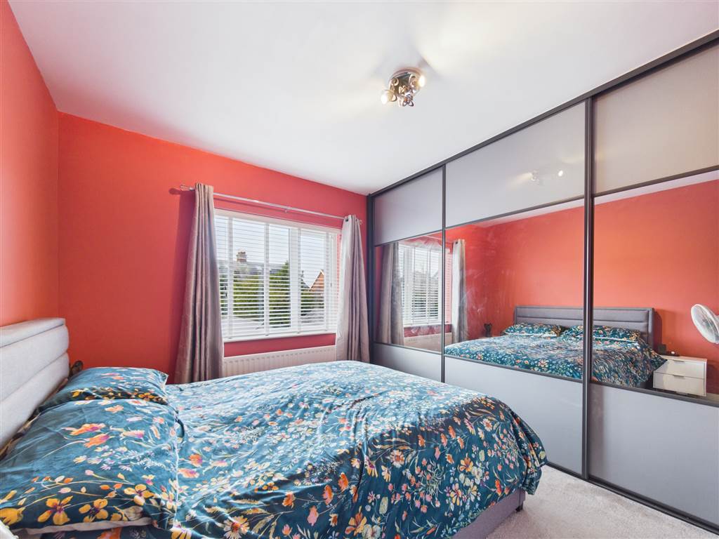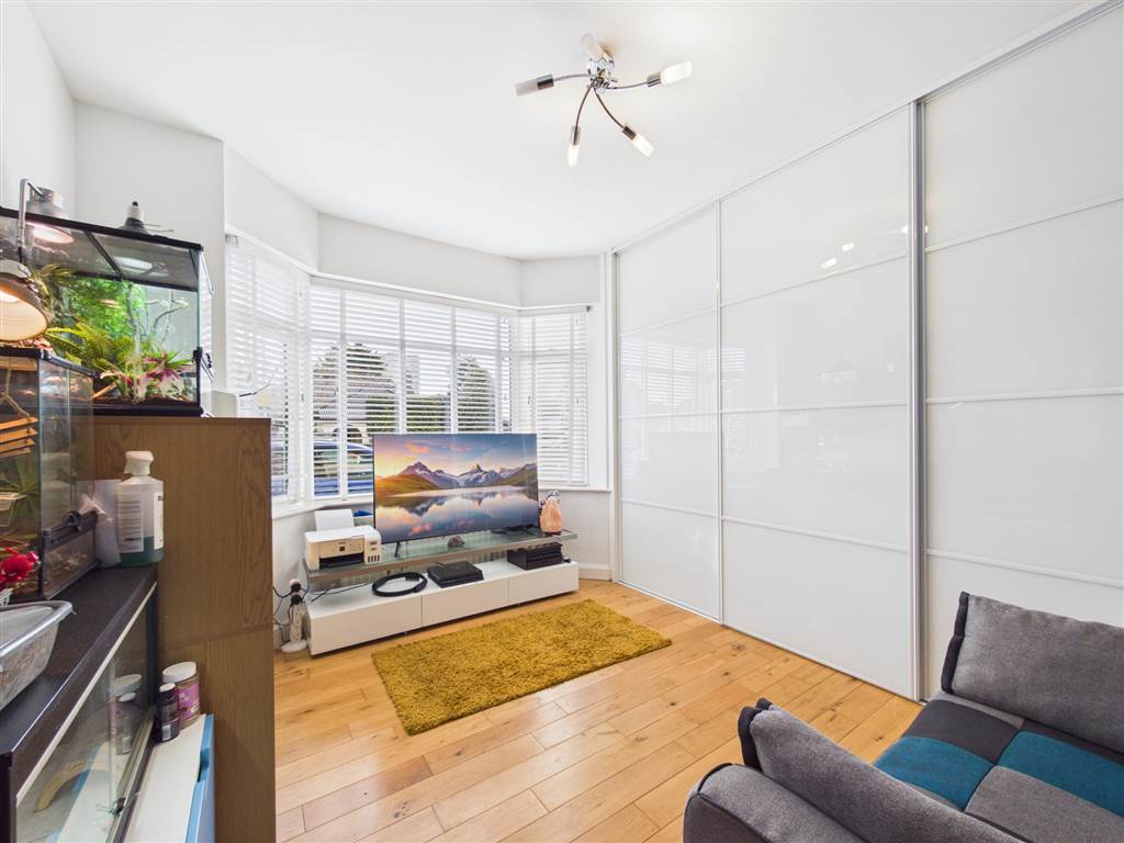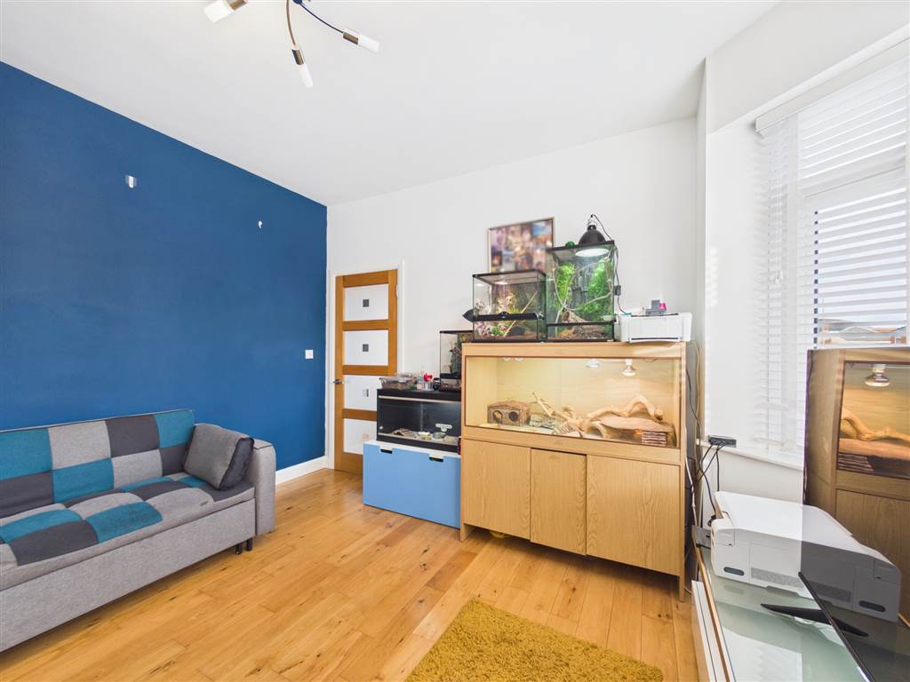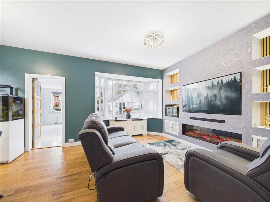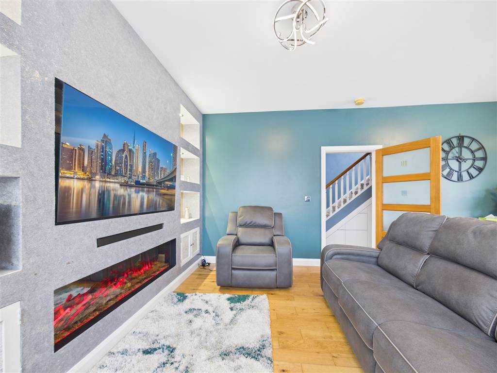 Solid wood flooring. Two bay windows. Feature wall with inset TV and soundbar storage. Electric log effect fire unit with lighting and remote controlled, inset shelving and cupboards with inset lighting. Covered radiator. (TV and soundbar not included).