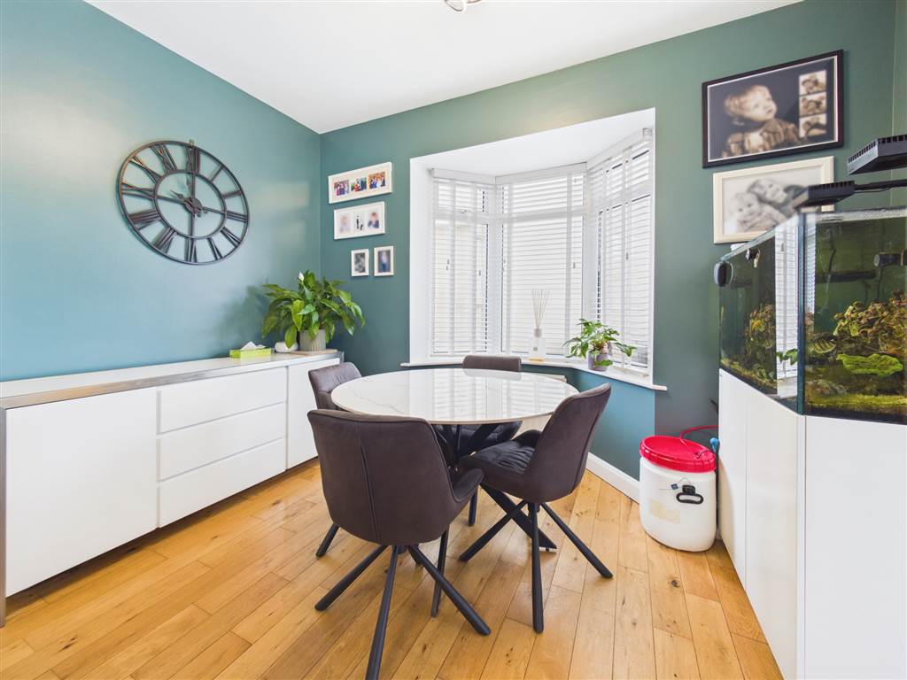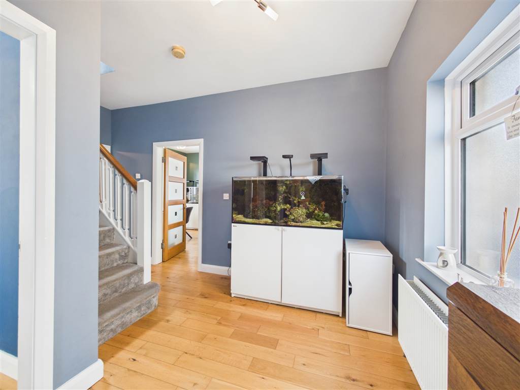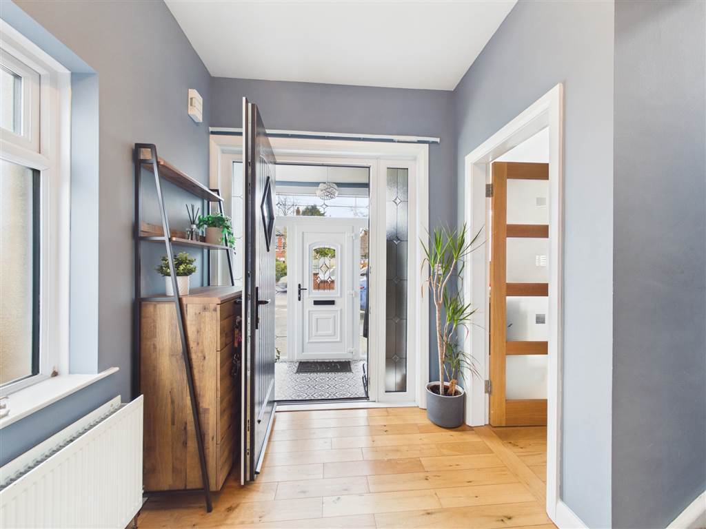 Composite door with diamond glazed panel. Solid wood flooring.