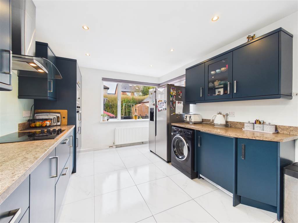 Extensive range of units with dark blue doors and contrasting worktop with upturns. Integrated appliances - 4 ring hob, microwave and oven, stainless steel extractor unit. Stainless steel sink unit with large and small bowls and pillar and flexible mixer tap. Tiled floor. Ceiling downlighting.