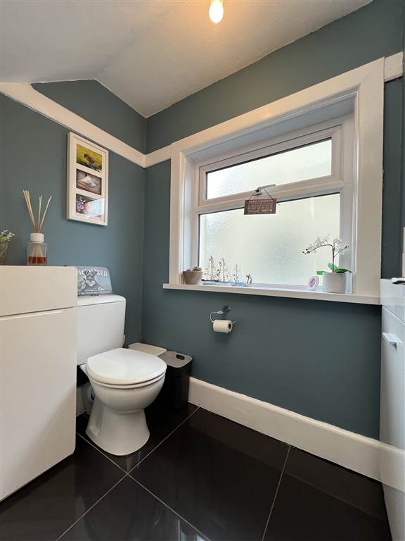 Vanity wash hand basin with mixer tap and tiled splashback. WC. Tiled floor. Storage under stairs.