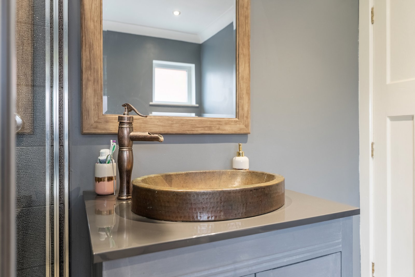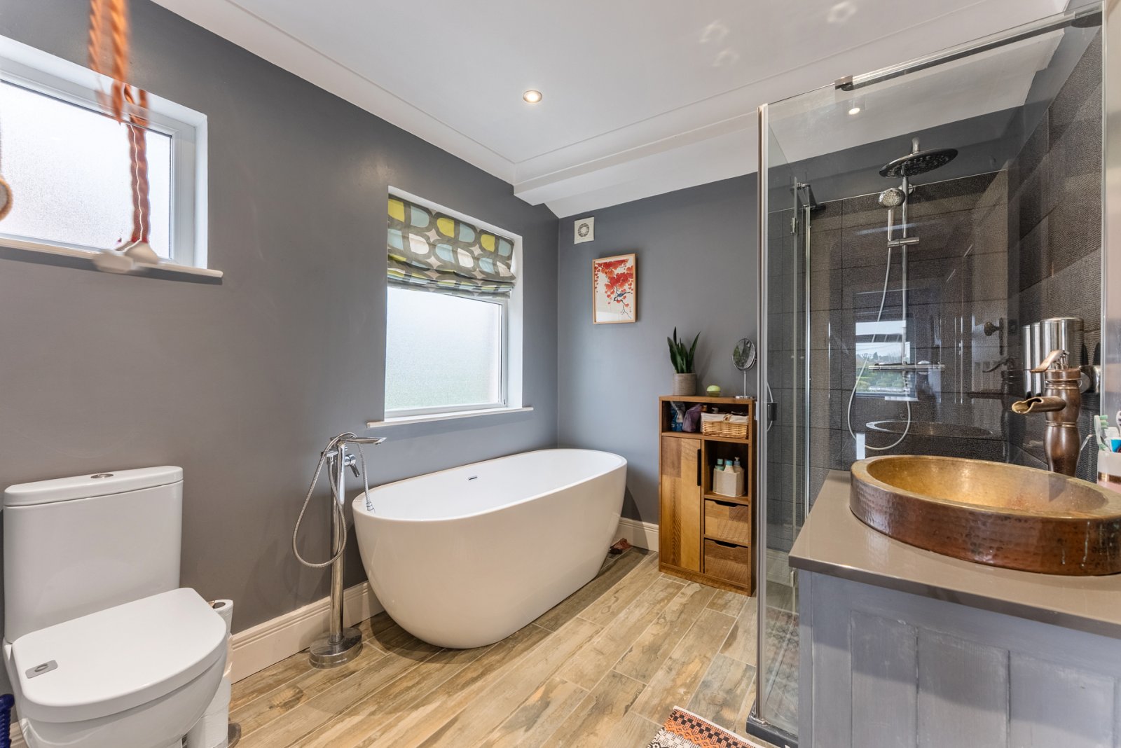 Luxury, contemporary suite comprising of a shower cubicle with designer tiling and chrome soap dispensers, free standing bath with chrome taps, feature copper bowl sink with storage under, low flush w.c, cornicing, wood effect tiled floor, partly tiled walls, spot lighting