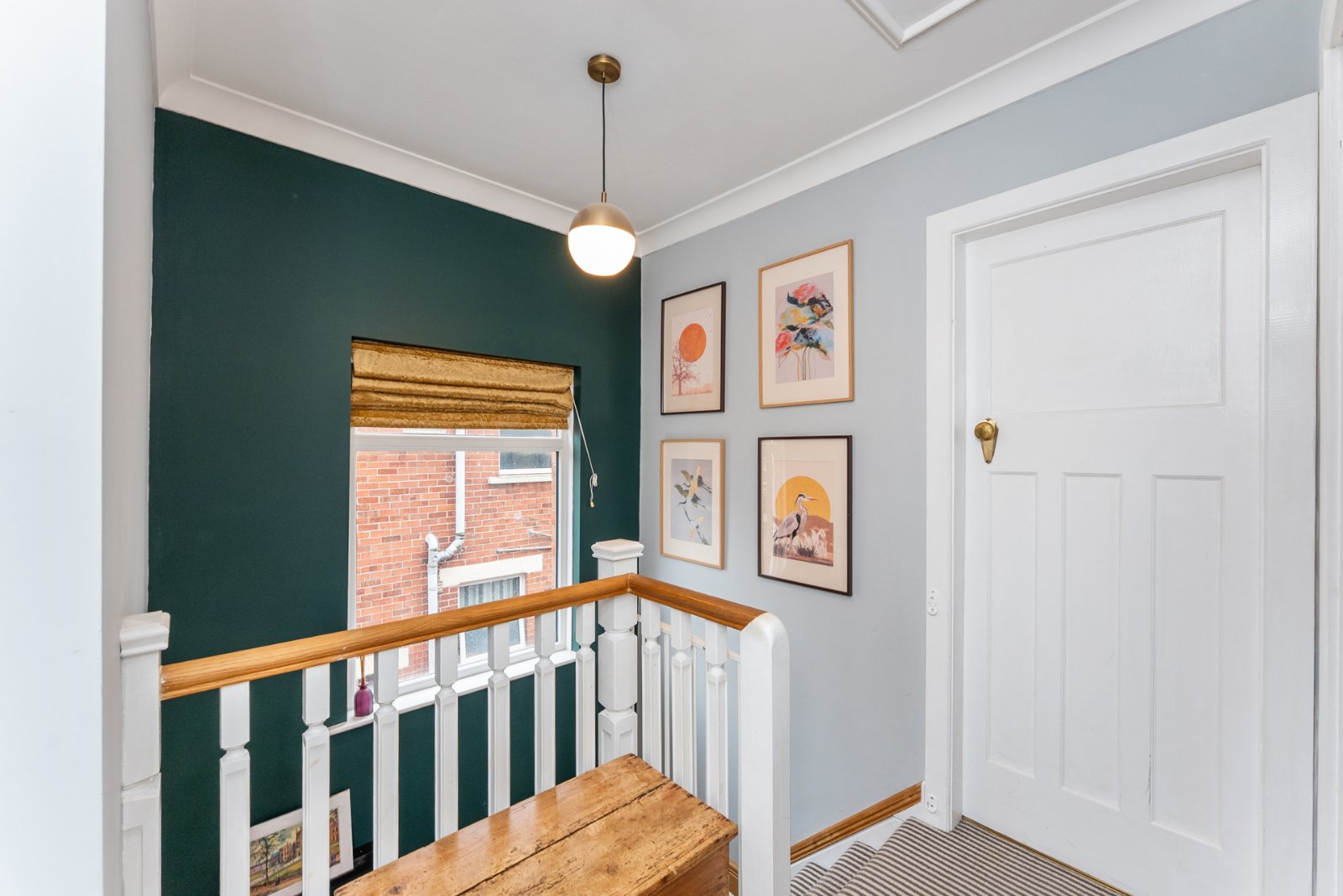 Glazed front door, cloakroom, under stair recess, Parquet flooring, cornicing