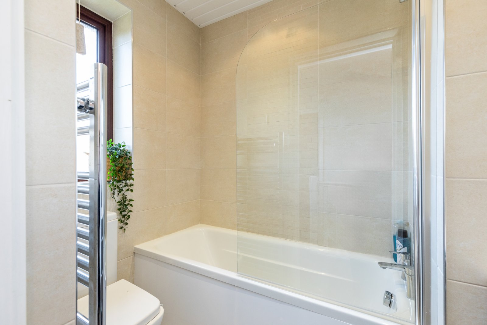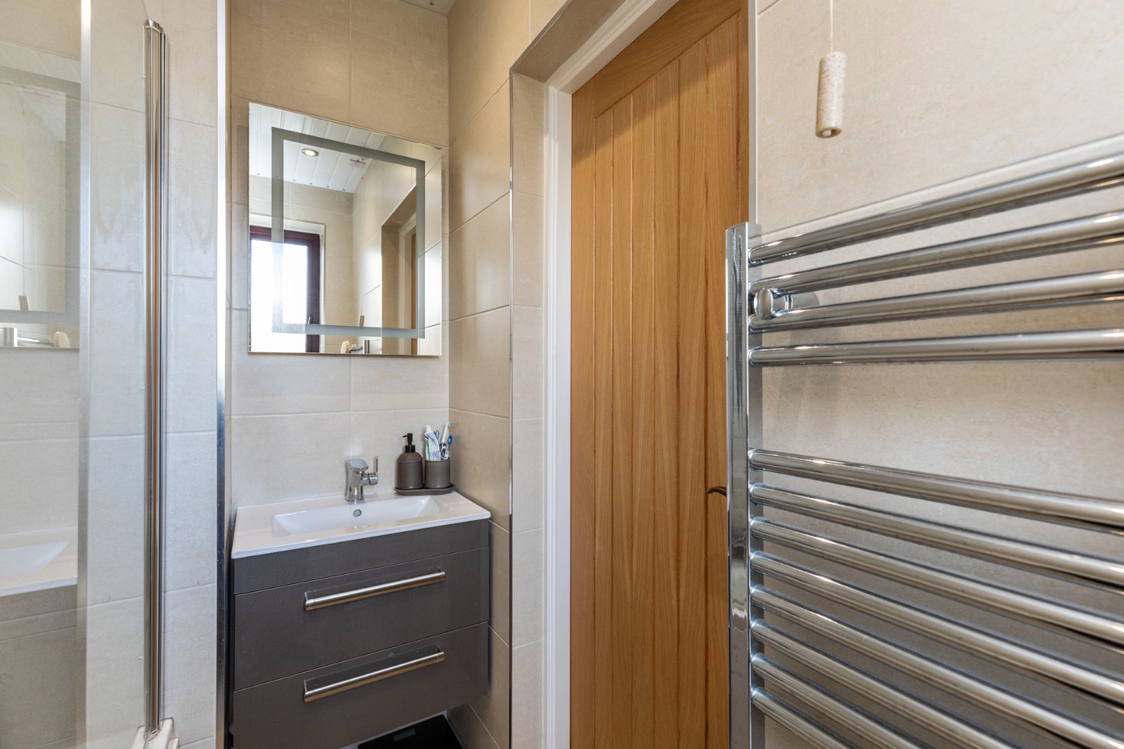 Modern fully tiled suite comprising WC, vanity unit, panelled bath with telephone hand shower, heated towel rail.