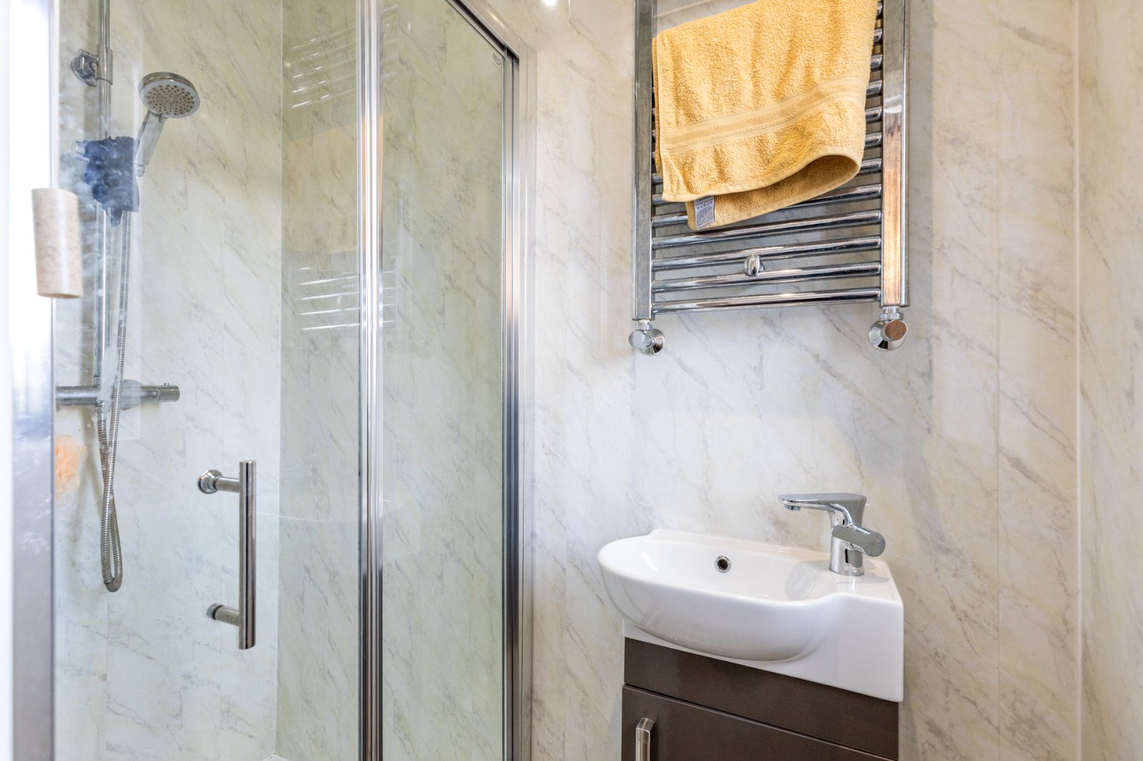 Modern uPVC panelled suite comprising corner shower cubicle, vanity unit and heated towel rail